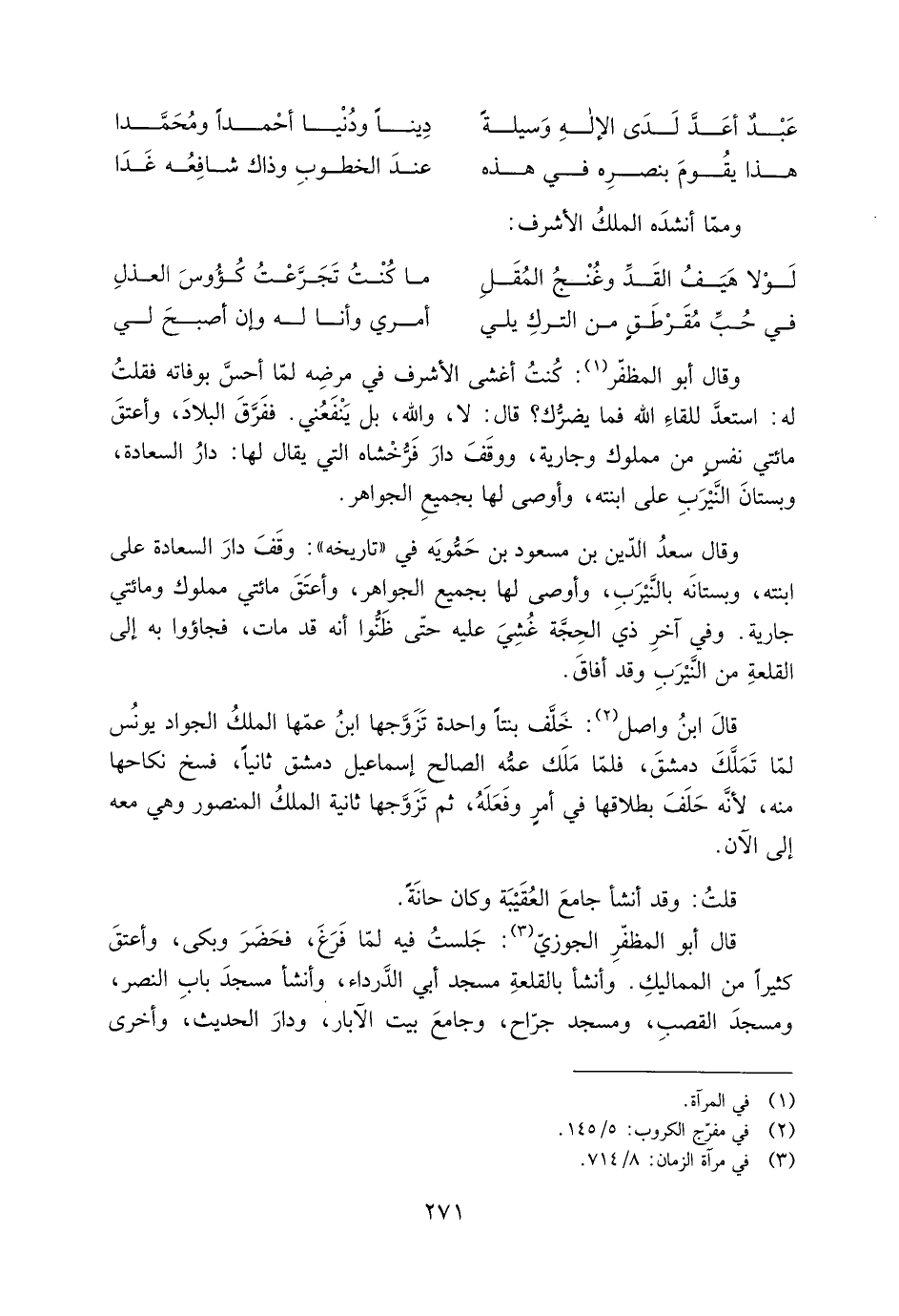 وقال أَبُو المظفَّر [1] : كُنتُ أغشى الأشرف فِي مرضه لمّا أحسِّ بوفاته فقلتُ لَهُ: استعدَّ للقاءِ اللَّه فما يضرُّك؟ قَالَ: لا، والله، بل يَنْفَعُني. ففَرَّق البلادَ، وأعتقَ مائتي نفسٍ من مملوك وجارية، ووقف دار فرّخ شاه التي يقال لها: دارُ السعادة، وبستانَ النَّيْرَبِ عَلَى ابنته، وأوصى لها بجميعِ الجواهر.