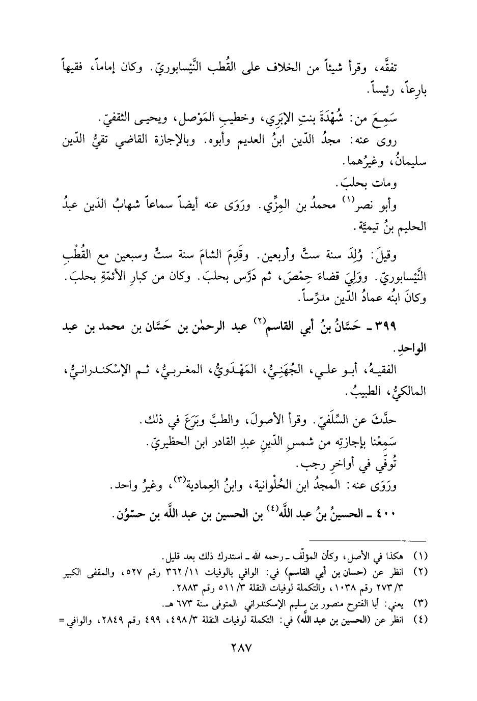 399- حَسَّانُ بنُ أَبِي القاسم [2] عَبْد الرَّحْمَن بْن حَسَّان بْن مُحَمَّد بْن عَبْد الواحد.