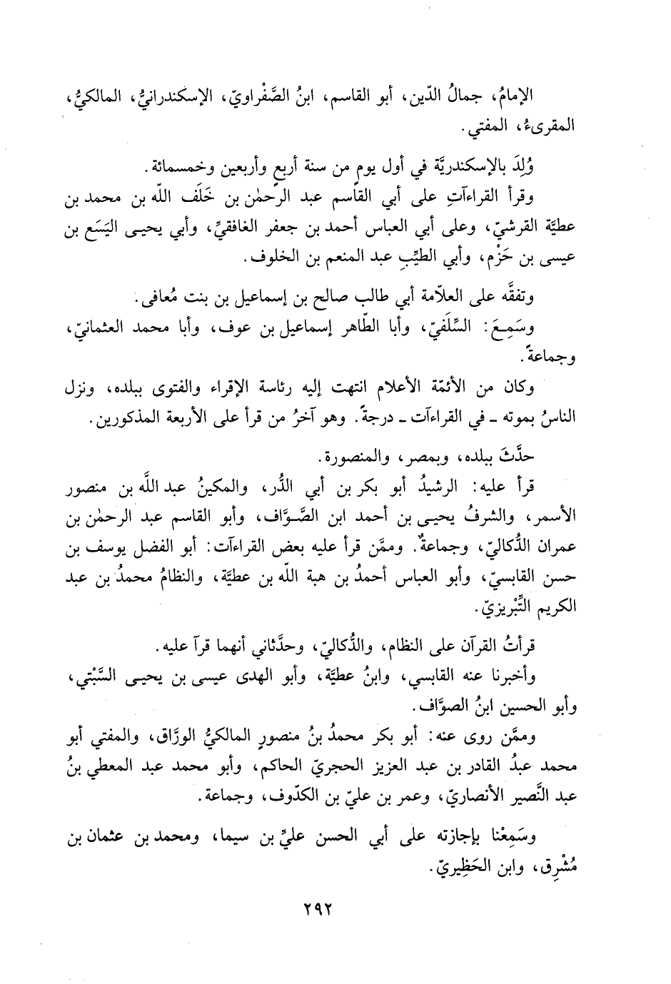 الإمام، جمال الدّين، أبو القاسم، ابن الصّفراويّ، الإسكندرانيُّ، المالكيُّ، المُقرئ، المفتي.