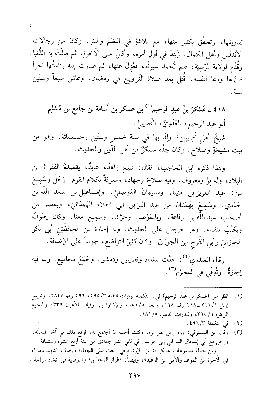 [1] انظر عن (عسكر بن عبد الرحيم) في: التكملة لوفيات النقلة 3/ 495، 496 رقم 2847، وتاريخ إربل 1/ 216- 218 رقم 118، والعبر 5/ 150، والإشارة إلى وفيات الأعيان 339، والنجوم الزاهرة 6/ 315، وشذرات الذهب 5/ 181.