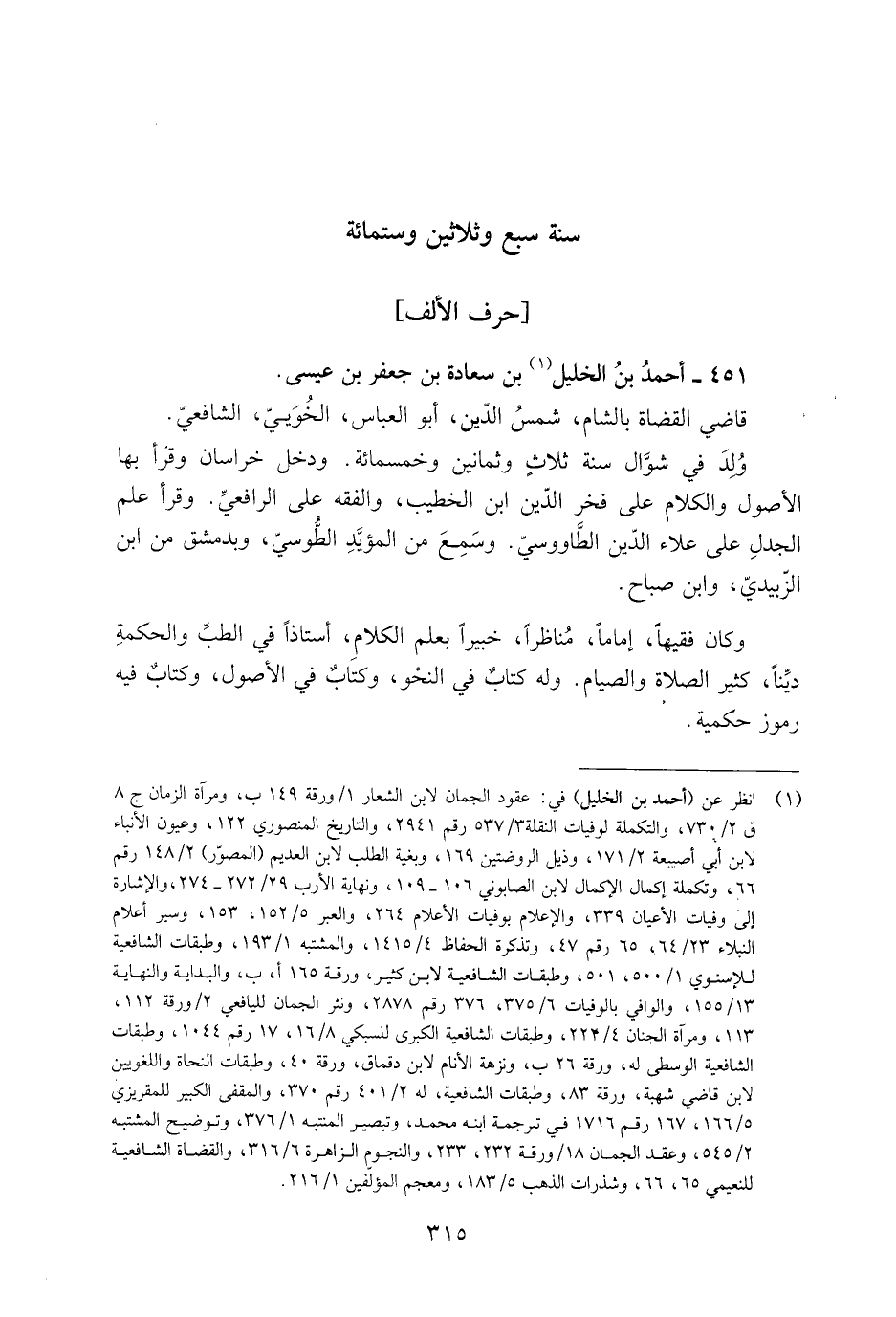 451- أَحْمَد بْن الخليل [1] بْن سعادة بْن جعْفَر بن عيسى.