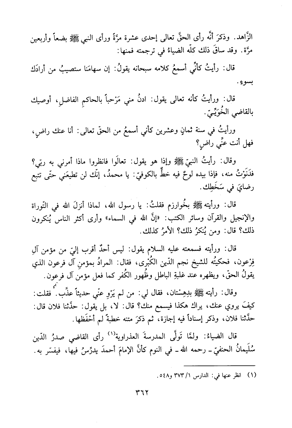 قَالَ الضياء: ولمَّا تولَّى المدرسة العذراوية [1] رَأَى القاضي صدرُ الدّين سُلَيْمَان الحنفيّ- رحمه اللَّه- فِي النوم كأنَّ الإمامَ أحمد يدرّس فيها، فيفسّر به.