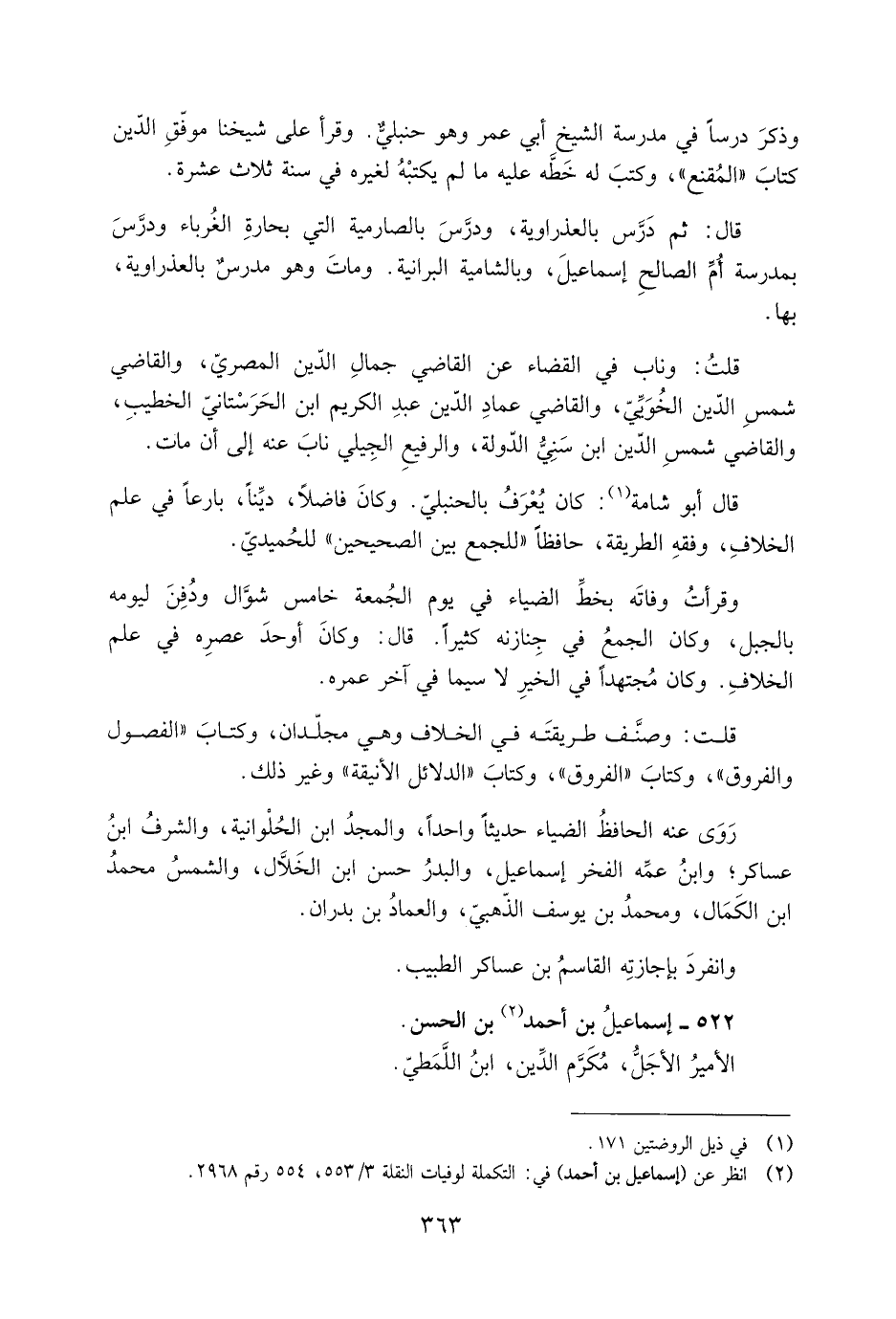 قَالَ أَبُو شامة [1] : كَانَ يُعْرفُ بالحنبليّ. وكانَ فاضلا، دَيِّنًا، بارعا فِي علم الخلافِ، وفقِه الطريقة، حافظا «للجمع بين الصحيحين» للحُميديّ.