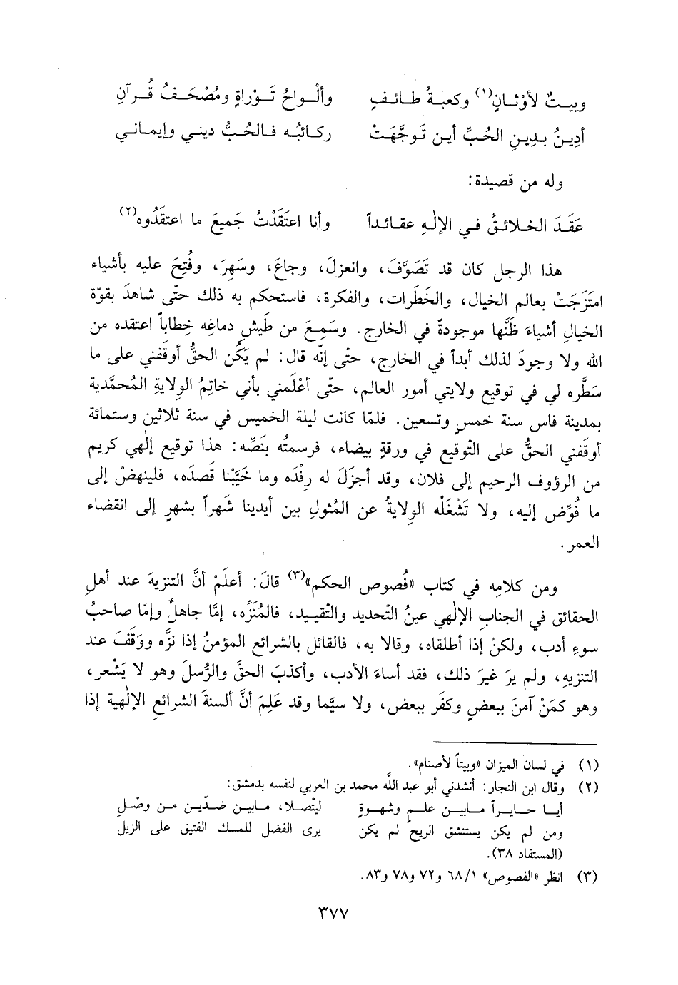 ومن كلامِه فِي كتاب «فُصوص الحَكَم» [3] قَالَ: اعلَمْ أنّ التنزيه عند أهل الحقائق فِي الجنابِ الإلهي عينُ التّحديد والتّقييد، فالمُنزه، إمَّا جاهلٌ وإمّا صاحب سوء أدب، ولكن إذ أطلقاه، وقالا بِهِ، فالقائل بالشرائع المؤمنُ إذا نزَّه ووَقَف عند التنزيه، ولم يرَ غيرَ ذَلِكَ، فقد أساء الأدب، وأكذبَ الحقّ والرُّسلَ وهو لا يَشْعر، وهو كمنْ آمنَ ببعضٍ وكفرَ ببعض، ولا سيَّما وقد عَلِمْ أنَّ ألسنة الشرائع الإلهية إذا