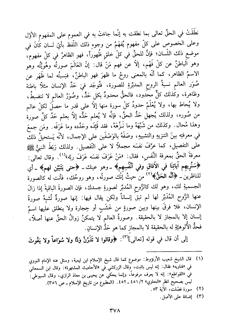 سَنُرِيهِمْ آياتِنا في الْآفاقِ وَفي أَنْفُسِهِمْ 41: 53- وهو عينك- حَتَّى يَتَبَيَّنَ لَهُمْ 41: 53- أي للناظرين- أَنَّهُ الْحَقُّ 2: 26 [2] من حيثُ إنّك صورته، وهو روحُك، فأنت له كالصورة الجسيمة لك، وهو لك كالرُّوحِ المُدبِّر لصورةِ جسدك، فإن الصورةَ الباقيةَ إذا زالَ عنها الرُّوح المُدبر لها لم تبق إنسانا ولكن يقال فيها: إنها صورةٌ تُشبِهُ صورةَ الُإِنْسَان، فلا فرق بينها وبين صورة من خشب أو حجارة ولا ينطبق عليها اسم إنسان إلا بالمجاز لا بالحقيقة. وصورة العالم لا يتمكن زوال الحقّ عنها أصلا، فحدُّ الأُلوهيَّةِ لَهُ بالحقيقة لا بالمجاز كما هُوَ حَدُّ الُإِنْسَانِ.