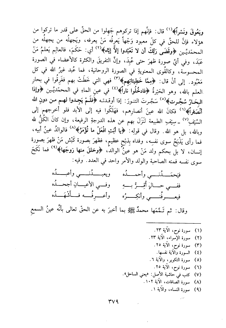 [1] قال: فإنّهم إذا تركوهم جَهِلوا من الحقِّ عَلَى قدر ما تركوا من هؤلاء فإنَّ للحقّ فِي كلّ معبود وَجْهًا يَعرفُه مَنْ يعرفه، ويَجهلُه من يجهلُه من المحمّديّين وَقَضى رَبُّكَ أَلَّا تَعْبُدُوا إِلَّا إِيَّاهُ 17: 23 [2] أي: حَكَمَ، فالعالمِ يَعلمُ مَنْ عَبَد، وفي أيِّ صورة ظهرَ حتى عُبِدَ، وإنّ التفريقَ والكثرة كالأعضاء فِي الصورة المحسوسة، وكالقوى المعنوية فِي الصورة الروحانية، فما عُبِدَ غيرُ اللَّه في كل معبود. إلى أن قَالَ: مِمَّا خَطِيئاتِهِمْ 71: 25 [3] فهي التي خَطَت بهم فغرقوا فِي بحارِ العلم باللَّه، وهو الحيرة فَأُدْخِلُوا ناراً 71: 25 [4] فِي عين الماءِ فِي المحمّديّين وَإِذَا الْبِحارُ سُجِّرَتْ 81: 6 [5] سَجَّرتَ التنورَ: إذا أوقدته فَلَمْ يَجِدُوا لَهُمْ من دُونِ الله أَنْصاراً 71: 25 [6] فكان الله عين أنصارهم، فهلكوا فيه إلى الأبد فلو أخرجهم إلى السّيف [7]- سيف الطبيعة لنزل بهم عن هذه الدرجَة الرفيعة، وإن كانَ الكُلُّ للَّه وباللَّه، بل هُوَ اللَّه. وقال فِي قولِه: يَا أَبَتِ افْعَلْ ما تُؤْمَرُ 37: 102 [8] فالوالد عينُ أَبِيهِ، فما رأى يَذْبَحُ سوى نفسِه، وفداه بذبح عظيم، فظهرَ بصورة كَبْش مَنْ ظهر بصورة إنسان، لا بل بحكم ولد مَنْ هُوَ عين الوالد، وَخَلَقَ مِنْها زَوْجَها 4: 1 [9] فما نَكَحَ سوى نفسه فمنه الصاحبة والولد والأمر واحد فِي العدد. وفيه: