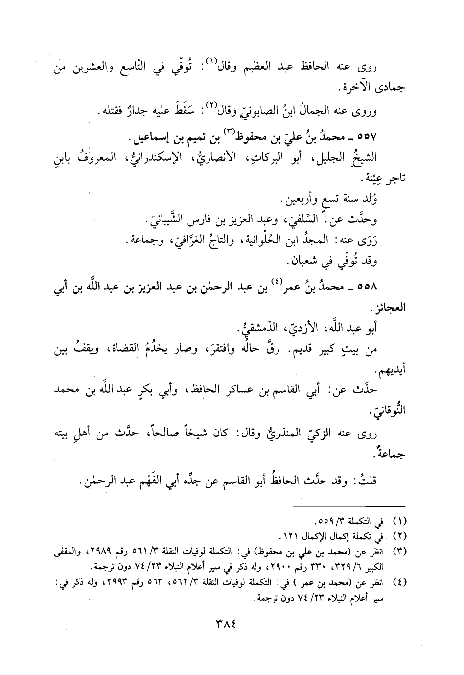 [3] انظر عن (محمد بن علي بن محفوظ) في: التكملة لوفيات النقلة 3/ 561 رقم 2989، والمقفى الكبير 6/ 329، 330 رقم 2900، وله ذكر في سير أعلام النبلاء 23/ 74 دون ترجمة.