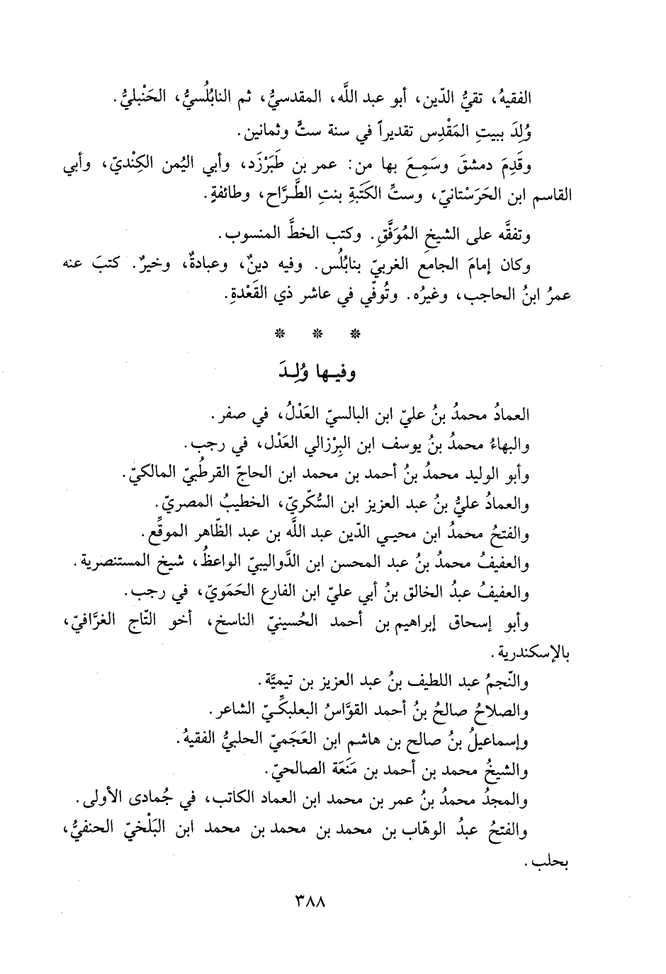 وفيها ولد العماد محمد بن عليّ ابن البالسيّ العَدْلُ، فِي صفر.