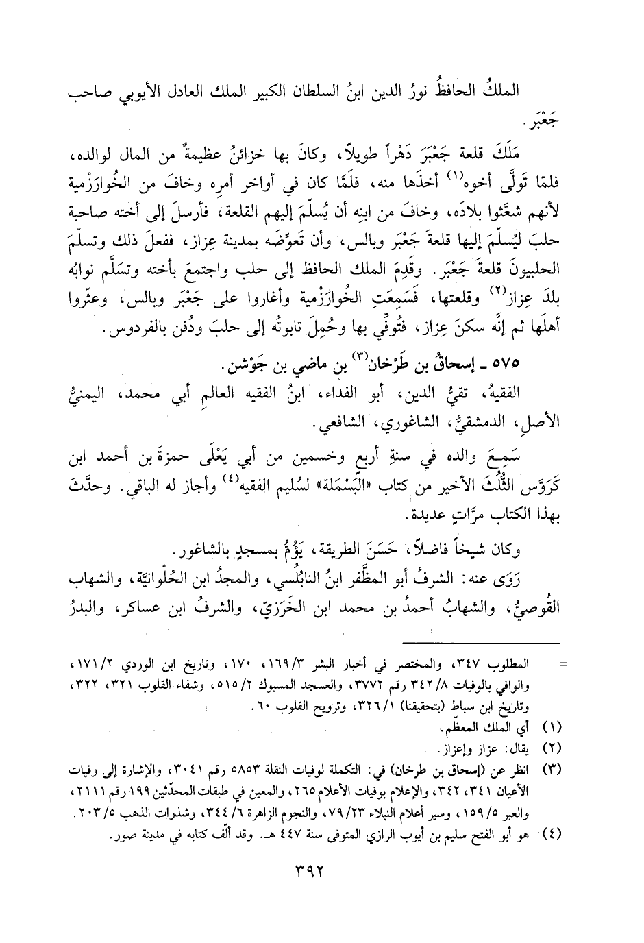 [ () ] المطلوب 347، والمختصر في أخبار البشر 3/ 169، 170، وتاريخ ابن الوردي 2/ 171، والوافي بالوفيات 8/ 342 رقم 3772، والعسجد المسبوك 2/ 515، وشفاء القلوب 321، 322، وتاريخ ابن سباط (بتحقيقنا) 1/ 326، وترويح القلوب 60.