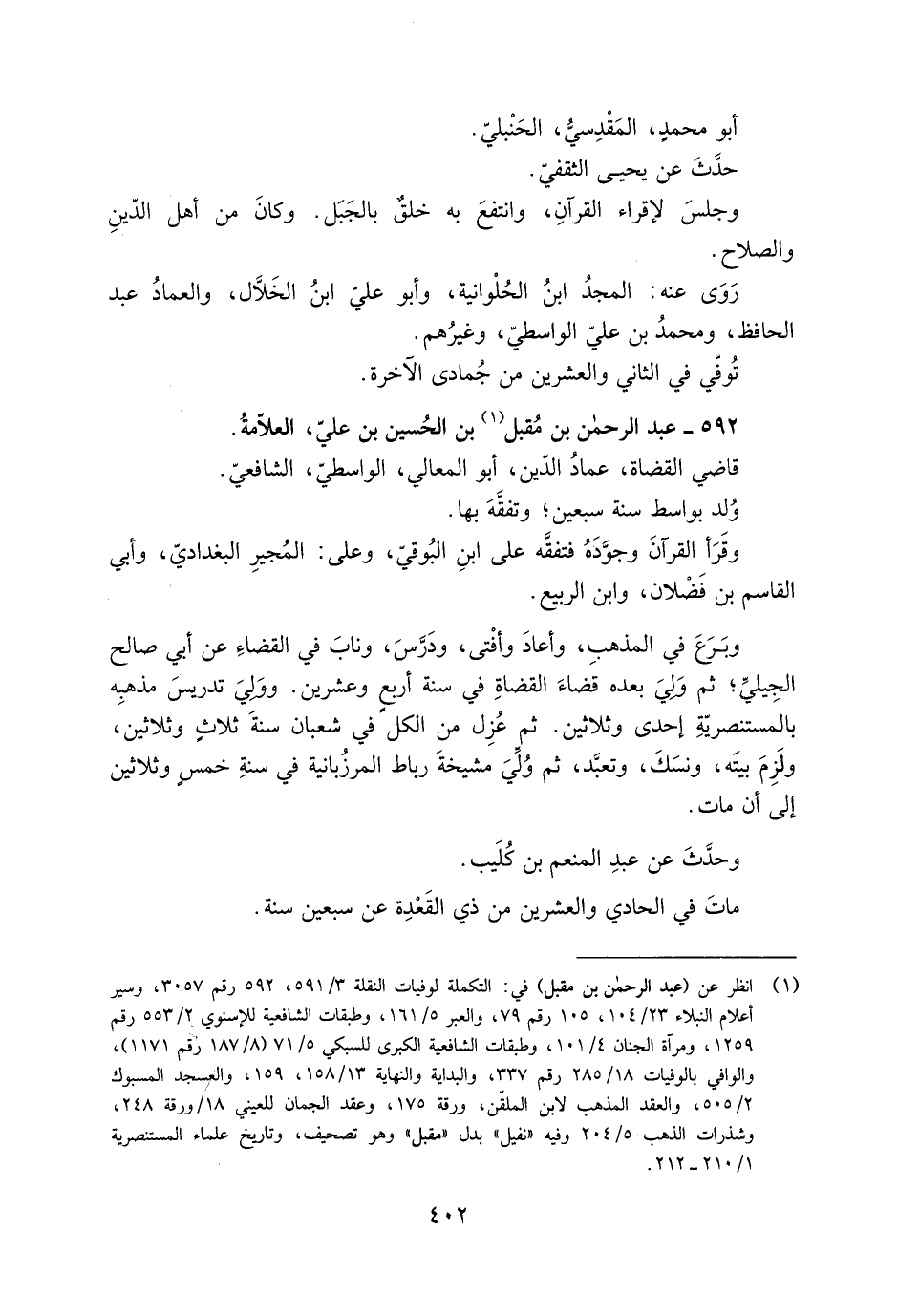 [1] انظر عن (عبد الرحمن بن مقبل) في: التكملة لوفيات النقلة 3/ 591، 592 رقم 3057، وسير أعلام النبلاء 23/ 104، 105 رقم 79، والعبر 5/ 161، وطبقات الشافعية للإسنويّ 2/ 553 رقم 1259، ومرآة الجنان 4/ 101، وطبقات الشافعية الكبرى للسبكي 5/ 71 (8/ 187 رقم 1171) ، والوافي بالوفيات 18/ 285 رقم 337، والبداية والنهاية 13/ 158، 159، والعسجد المسبوك 2/ 505، والعقد المذهب لابن الملقّن، ورقة 175، وعقد الجمان للعيني 18/ ورقة 248، وشذرات الذهب 5/ 204 وفيه «نفيل» بدل «مقبل» وهو تصحيف، وتاريخ علماء المستنصرية 1/ 210- 212.