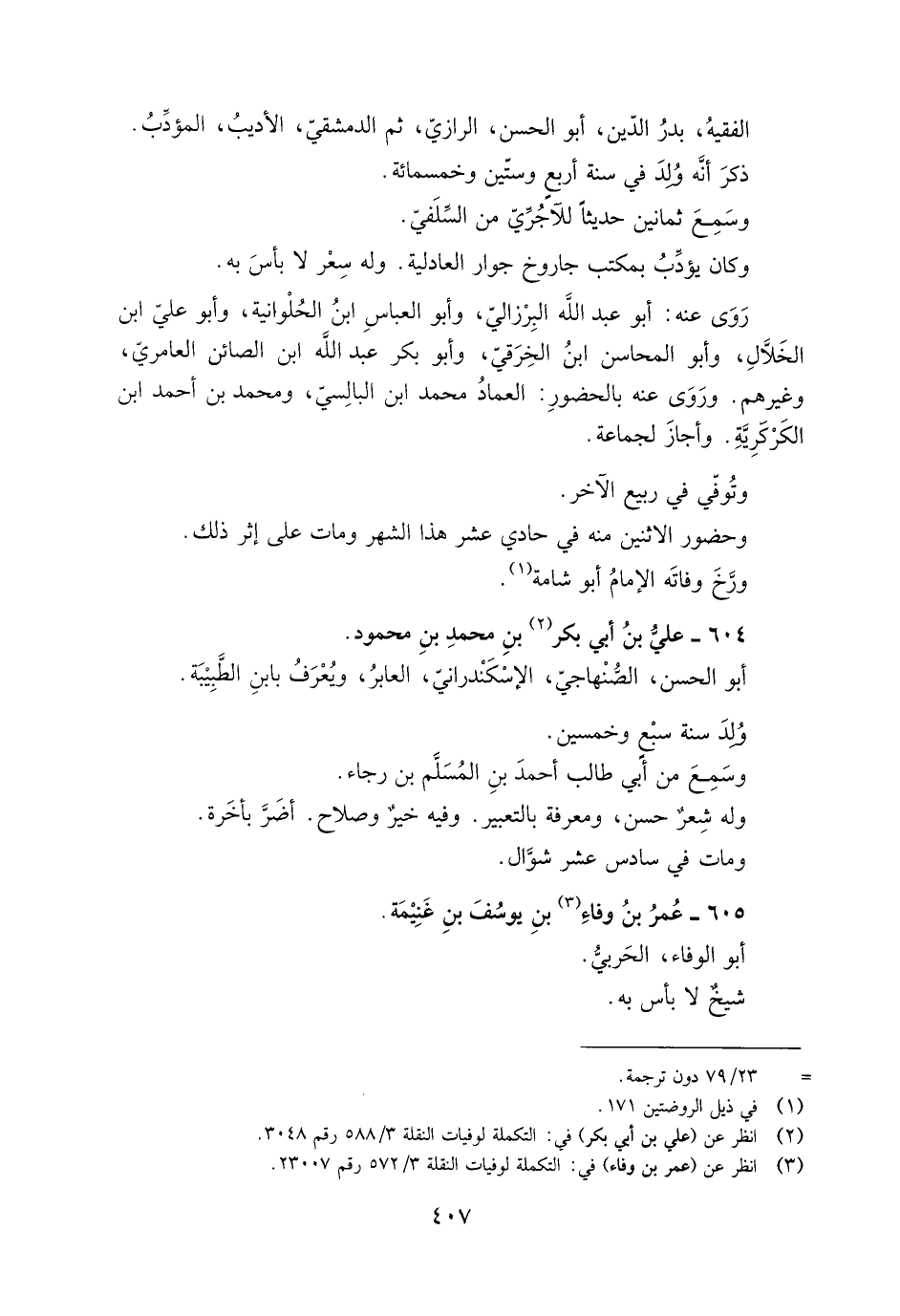 605- عُمَر بن وفاءِ [3] بن يوسف بن غَنِيمة.