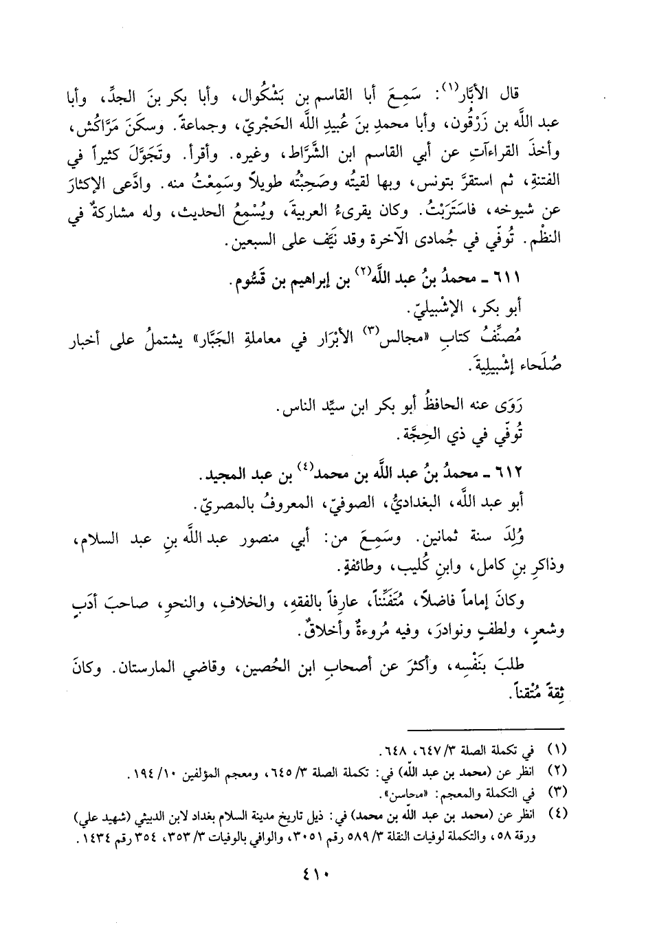 [4] انظر عَنْ (مُحَمَّدِ بْنِ عَبْدِ اللَّهِ بْنِ مُحَمَّدِ) في: ذيل تاريخ مدينة السلام بغداد لابن الدبيثي (شهيد علي) ورقة 58، والتكملة لوفيات النقلة 3/ 589 رقم 3051، والوافي بالوفيات 3/ 353، 354 رقم 1434.