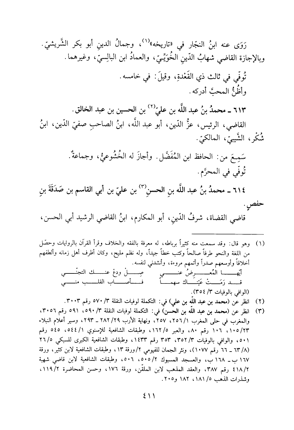 [3] انظر عن (محمد بن عبد الله بن الحسن) في: التكملة لوفيات النقلة 3/ 590، 591 رقم 3056، والمغرب في حلى المغرب 1/ 256، 257، ونهاية الأرب 29/ 282- 293، وسير أعلام النبلاء 23/ 105، 106 رقم 80، والعبر 5/ 162، وطبقات الشافعية للإسنويّ 1/ 544، و 545 رقم 501، والوافي بالوفيات 3/ 352، 353 رقم 1433، وطبقات الشافعية الكبرى للسبكي 5/ 26 (8/ 63- 66 رقم 1077) ، ونثر الجمان للفيومي 2/ ورقة 13، وطبقات الشافعية لابن كثير، ورقة 167 ب- 168 ب، والعسجد المسبوك 2/ 505، 506، وطبقات الشافعية لابن قاضي شهبة 2/ 418 رقم 387، والعقد المذهب لابن الملقّن، ورقة 176، وحسن المحاضرة 2/ 119، وشذرات الذهب 5/ 181، 182 و 205.