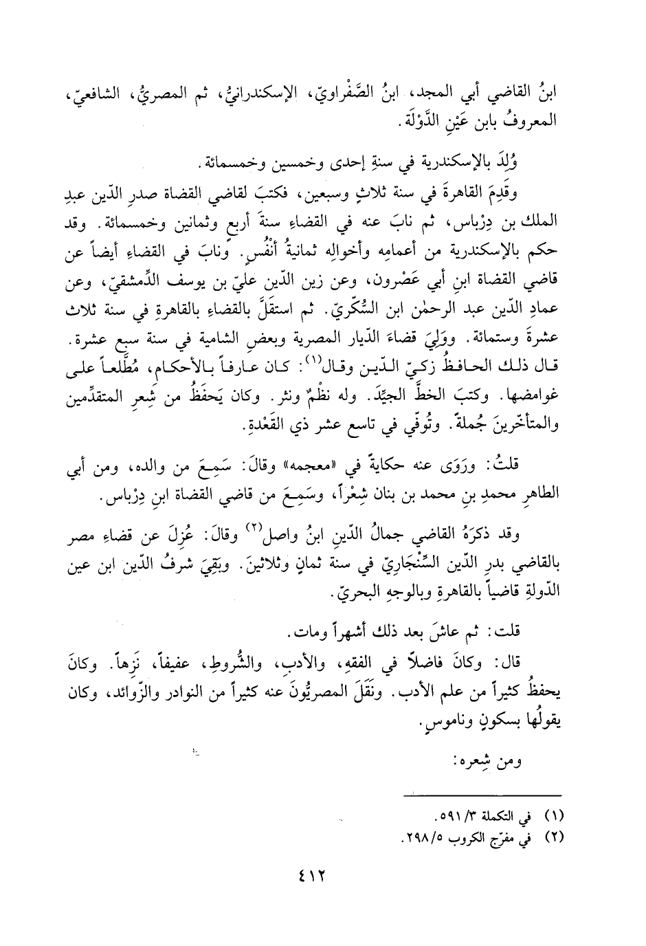 قَالَ ذَلِكَ الحافظُ زكيّ الدّين وقال [1] : كَانَ عارفا بالأحكام، مُطَّلعًا عَلَى غوامضها. وكتبَ الخطَّ الجيدَ. وله نظْمٌ ونثر. وكان يَحفَظُ من شِعرِ المتقدِّمين والمتأخرينَ جُملةً. وتُوُفّي فِي تاسع عشر ذي القَعْدَةِ.