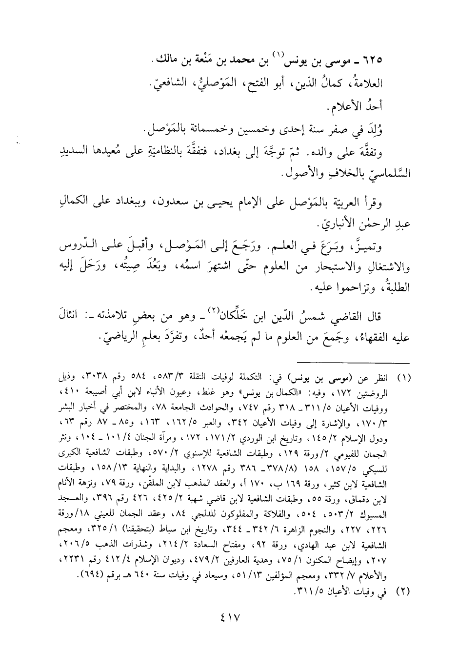 [1] انظر عن (موسى بن يونس) في: التكملة لوفيات النقلة 3/ 583، 584 رقم 3038، وذيل الروضتين 172، وفيه: «الكمال بن يونس» وهو غلط، وعيون الأنباء لابن أبي أصيبعة 410، ووفيات الأعيان 5/ 311- 318 رقم 747، والحوادث الجامعة 78، والمختصر في أخبار البشر 3/ 170، والإشارة إلى وفيات الأعيان 342، والعبر 5/ 162، 163، و 85- 87 رقم 63، ودول الإسلام 2/ 145، وتاريخ ابن الوردي 2/ 171، 172، ومرآة الجنان 4/ 101- 104، ونثر الجمان للفيومي 2/ ورقة 129، وطبقات الشافعية للإسنويّ 2/ 570، وطبقات الشافعية الكبرى للسبكي 5/ 157، 158 (8/ 378- 386 رقم 1278، والبداية والنهاية 13/ 158، وطبقات الشافعية لابن كثير، ورقة 169 ب، 170 أ، والعقد المذهب لابن الملقّن، ورقة 79، ونزهة الأنام لابن دقماق، ورقة 55، وطبقات الشافعية لابن قاضي شهبة 2/ 425، 426 رقم 396، والعسجد المسبوك 2/ 503، 504، والفلاكة والمفلوكون للدلجي 84، وعقد الجمان للعيني 18/ ورقة 226، 227، والنجوم الزاهرة 6/ 342- 344، وتاريخ ابن سباط (بتحقيقنا) 1/ 325، ومعجم الشافعية لابن عبد الهادي، ورقة 92، ومفتاح السعادة 2/ 214، وشذرات الذهب 5/ 206، 207، وإيضاح المكنون 1/ 75، وهدية العارفين 2/ 479، وديوان الإسلام 4/ 412 رقم 2231، والأعلام 7/ 332، ومعجم المؤلفين 13/ 51، وسيعاد في وفيات سنة 640 هـ برقم (694) .