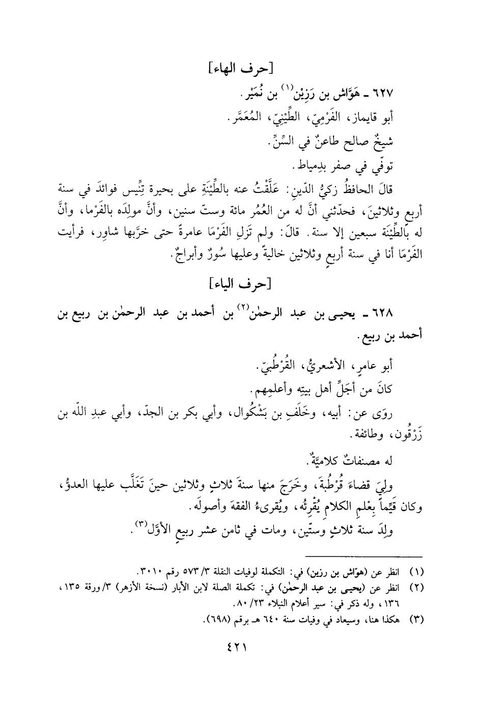 [2] انظر عن (يحيى بن عبد الرحمن) في: تكملة الصلة لابن الأبار (نسخة الأزهر) 3/ ورقة 135، 136، وله ذكر في: سير أعلام النبلاء 23/ 80.