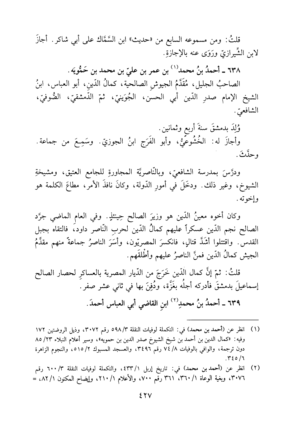 [1] انظر عن (أحمد بن محمد) في: التكملة لوفيات النقلة 3/ 598 رقم 3072، وذيل الروضتين 172 وفيه: «كمال الدين بن أحمد بن شيخ الشيوخ صدر الدين بن حمويه» ، وسير أعلام النبلاء 23/ 85 دون ترجمة، والوافي بالوفيات 8/ 74 رقم 3496، والعسجد المسبوك 2/ 515، والنجوم الزاهرة 6/ 345.