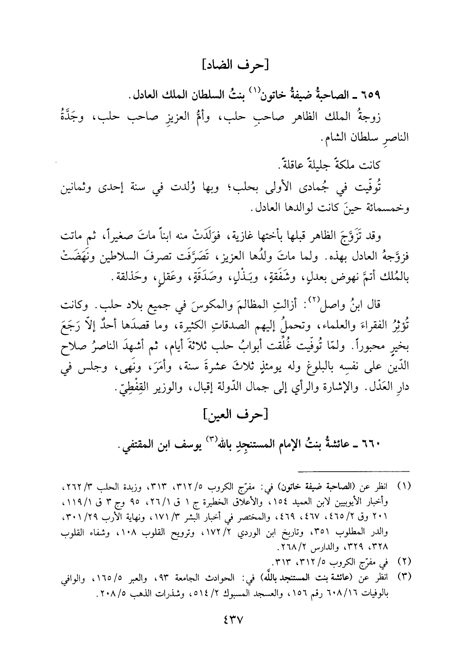 [3] انظر عن (عائشة بنت المستنجد باللَّه) في: الحوادث الجامعة 93، والعبر 5/ 165، والوافي بالوفيات 16/ 608 رقم 156، والعسجد المسبوك 2/ 514، وشذرات الذهب 5/ 208.