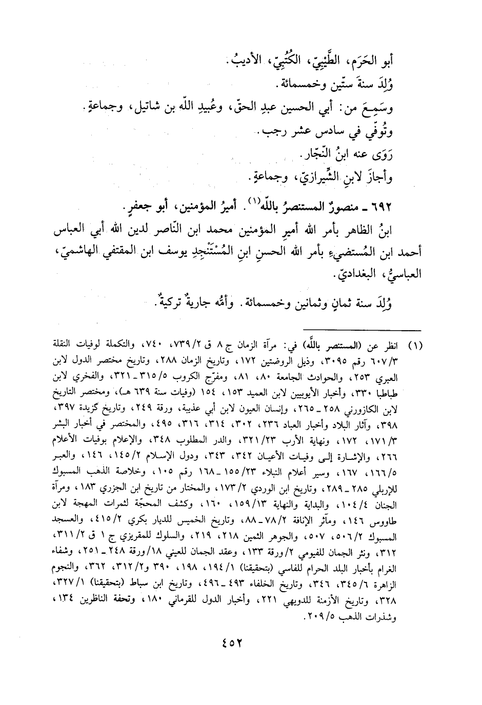 [1] انظر عن (المستنصر باللَّه) في: مرآة الزمان ج 8 ق 2/ 739، 740، والتكملة لوفيات النقلة 3/ 607 رقم 3095، وذيل الروضتين 172، وتاريخ الزمان 288، وتاريخ مختصر الدول لابن العبري 253، والحوادث الجامعة 80، 81، ومفرّج الكروب 5/ 315- 321، والفخري لابن طباطبا 330، وأخبار الأيوبيين لابن العميد 153، 154 (وفيات سنة 639 هـ) ، ومختصر التاريخ لابن الكازروني 258- 265، وإنسان العيون لابن أبي عذيبة، ورقة 249، وتاريخ گزيدة 397، 398، وآثار البلاد وأخبار العباد 236، 302، 314، 316، 495، والمختصر في أخبار البشر 3/ 171، 172، ونهاية الأرب 23/ 321، والدر المطلوب 348، والإعلام بوفيات الأعلام 266، والإشارة إلى وفيات الأعيان 342، 343، ودول الإسلام 2/ 145، 146، والعبر 5/ 166، 167، وسير أعلام النبلاء 23/ 155- 168 رقم 105، وخلاصة الذهب المسبوك للإربلي 285- 289، وتاريخ ابن الوردي 2/ 173، والمختار من تاريخ ابن الجزري 183، ومرآة الجنان 4/ 104، والبداية والنهاية 13/ 159، 160، وكشف المحجّة لثمرات المهجة لابن طاووس 146، ومآثر الإنافة 2/ 78- 88، وتاريخ الخميس للدياربكري 2/ 415، والعسجد المسبوك 2/ 506، 507، والجوهر الثمين 218، 219، والسلوك للمقريزي ج 1 ق 2/ 311، 312، ونثر الجمان للفيومي 2/ ورقة 133، وعقد الجمان للعيني 18/ ورقة 248- 251، وشفاء الغرام بأخبار البلد الحرام للفاسي (بتحقيقنا) 1/ 194، 198، 390، و 2/ 312، 362، والنجوم الزاهرة 6/ 345، 346، وتاريخ الخلفاء 493- 496، وتاريخ ابن سباط (بتحقيقنا) 1/ 327، 328، وتاريخ الأزمنة للدويهي 221، وأخبار الدول للقرماني 180، وتحفة الناظرين 134، وشذرات الذهب 5/ 209.