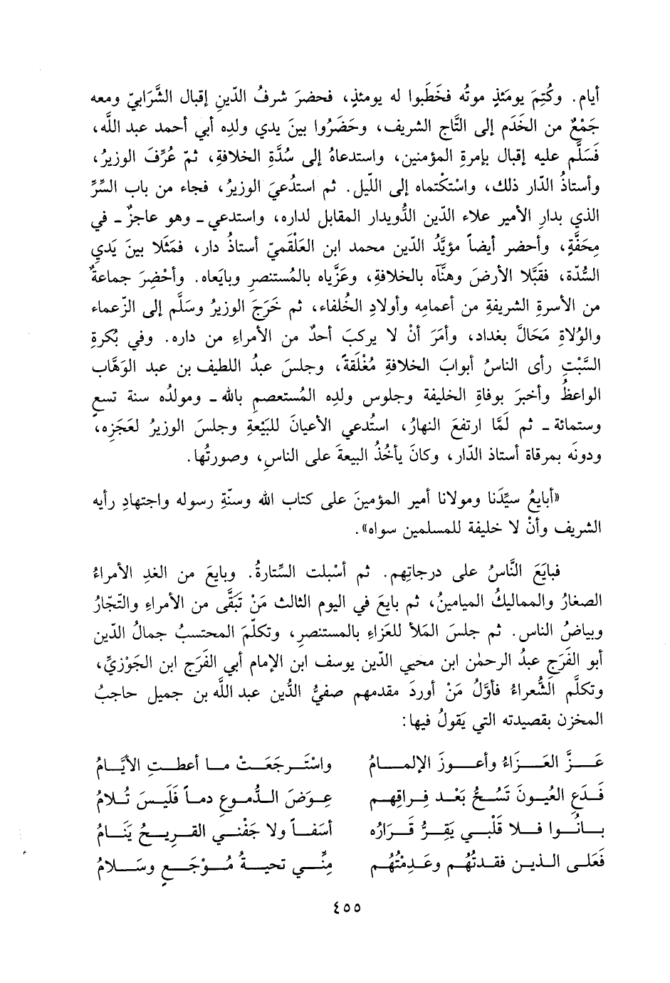 أيام. وكُتِمَ يومئذٍ موتهُ فخَطَبوا لَهُ يومئذٍ، فحضرَ شرفُ الدّين إقبال الشَّرابيّ ومعه جَمْعٌ من الخَدَم إلى التّاج الشريف، وحَضَروا بين يدي ولدِه أَبِي أَحْمَد عَبْد اللَّه، فَسَلَّم عَلَيْهِ إقبال بإمرَة المؤمنين، واستدعاهُ إلى سُدَّةِ الخلافةِ، ثمّ عَرَفَ الوزيرُ، وأستاذُ الدّار ذَلِكَ، واسْتكْتماه إلى اللّيل. ثم استدُعيّ الوزيرُ، فجاء من باب السِّرِّ الّذِي بدارِ الأمير علاء الدّين الدُّويدار المقابل لداره، واستدعي- وهو عاجزٌ- فِي مِحَفَّةٍ، وأحضر أيضا مؤيَّدُ الدّين مُحَمَّد ابن العَلْقَميّ أستاذُ دار، فمَثَلا بينَ يَدي السُّدّة، فقبّلا الأرض وهنّئاه بالخلافَة، وعَزَّياه بالمستنصرِ وبايَعاه. وأحْضِرَ جماعةٌ من الأسرةِ الشريفَة من أعمامِه وأولادِ الخُلفاء، ثم خَرَجَ الوزيرُ وسَلَّم إلى الزّعماء والوُلاةِ مَحَالَّ بغداد، وأمر أن لا يركبَ أحدٌ من الأمراءِ من داره. وفي بُكرةِ السَّبْتِ رَأَى الناسُ أبوابَ الخلافةِ مُغْلَقةً، وجلسَ عبدُ اللطيف بن عَبْد الوَهَّاب الواعظُ وأخبرَ بوفاةِ الخليفة وجلوس ولدِه المُستعصم باللَّه- ومولده سنة تسع وستمائة- ثم لمّا ارتفع النهار، استدعي الأعيان للبَيْعَةِ وجلسَ الوزيرُ لعَجزِه، ودونَه بمرقاة أستاذ الدّار، وكانَ يأخُذُ البيعةَ عَلَى الناسِ، وصورتُها.