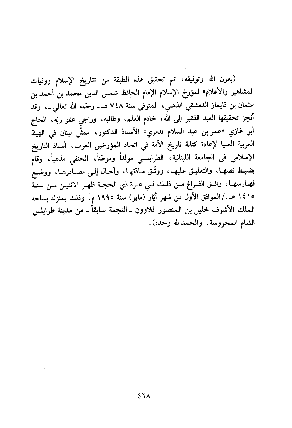 (بعون الله وتوفيقه، ثم تحقيق هذه الطبقة من «تاريخ الإسلام ووفيات المشاهير والأعلام» لمؤرخ الإسلام الإمام الحافظ شمسُ الدين مُحَمَّدُ بْنُ أَحْمَد بْن عثمان بن قايماز الدمشقيّ الذهبي، المتوفى سنة 748 هـ- رحمه الله تعالى-، وقد أنجز تحقيقها العبد الفقير إلى الله، خادم العلم، وطالبه، وراجي عفو ربّه، الحاج أبو غازي «عمر بن عبد السلام تدمري» الأستاذ الدكتور، ممثّل لبنان في الهيئة العربية العليا لإعادة كتابة تاريخ الأمة في اتحاد المؤرخين العرب، أستاذ التاريخ الإسلامي في الجامعة اللبنانية، الطرابلسي مولدا وموطنا، الحنفي مذهبا، وقام بضبط نصها، والتعليق عليها، ووثّق مادّتها، وأحال إلى مصادرها، ووضع فهارسها، وافق الفراغ من ذلك في غرة ذي الحجة ظهر الاثنين من سنة 1415 هـ. / الموافق الأول من شهر أيّار (مايو) سنة 1995 م. وذلك بمنزله بساحة الملك الأشرف خليل بن المنصور قلاوون- النجمة سابقا- من مدينة طرابلس الشام المحروسة. والحمد للَّه وحده) .
