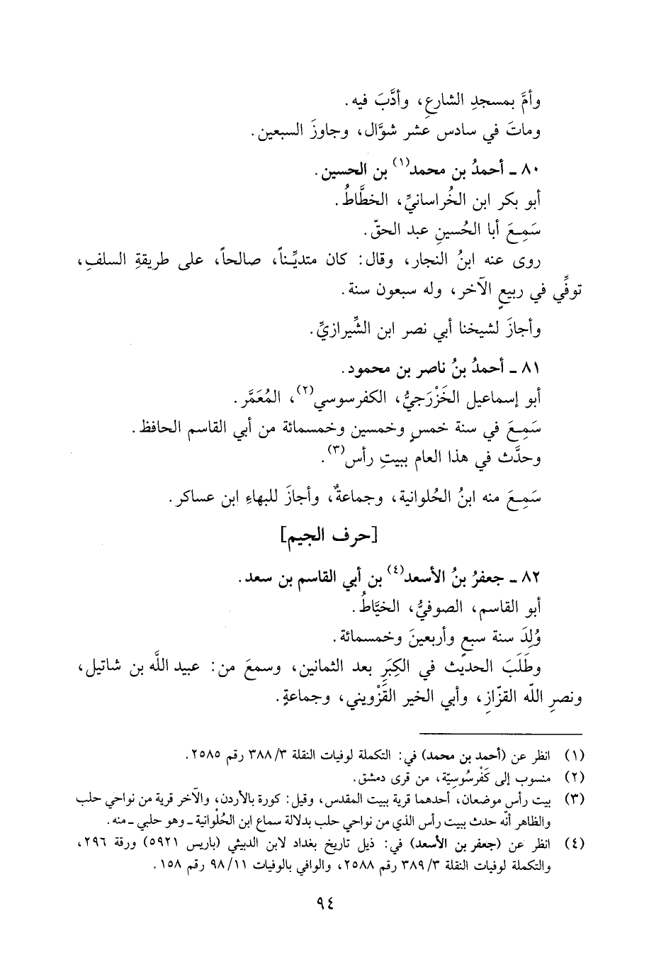 [4] انظر عن (جعفر بن الأسعد) في: ذيل تاريخ بغداد لابن الدبيثي (باريس 5921) ورقة 296، والتكملة لوفيات النقلة 3/ 389 رقم 2588، والوافي بالوفيات 11/ 98 رقم 158.
