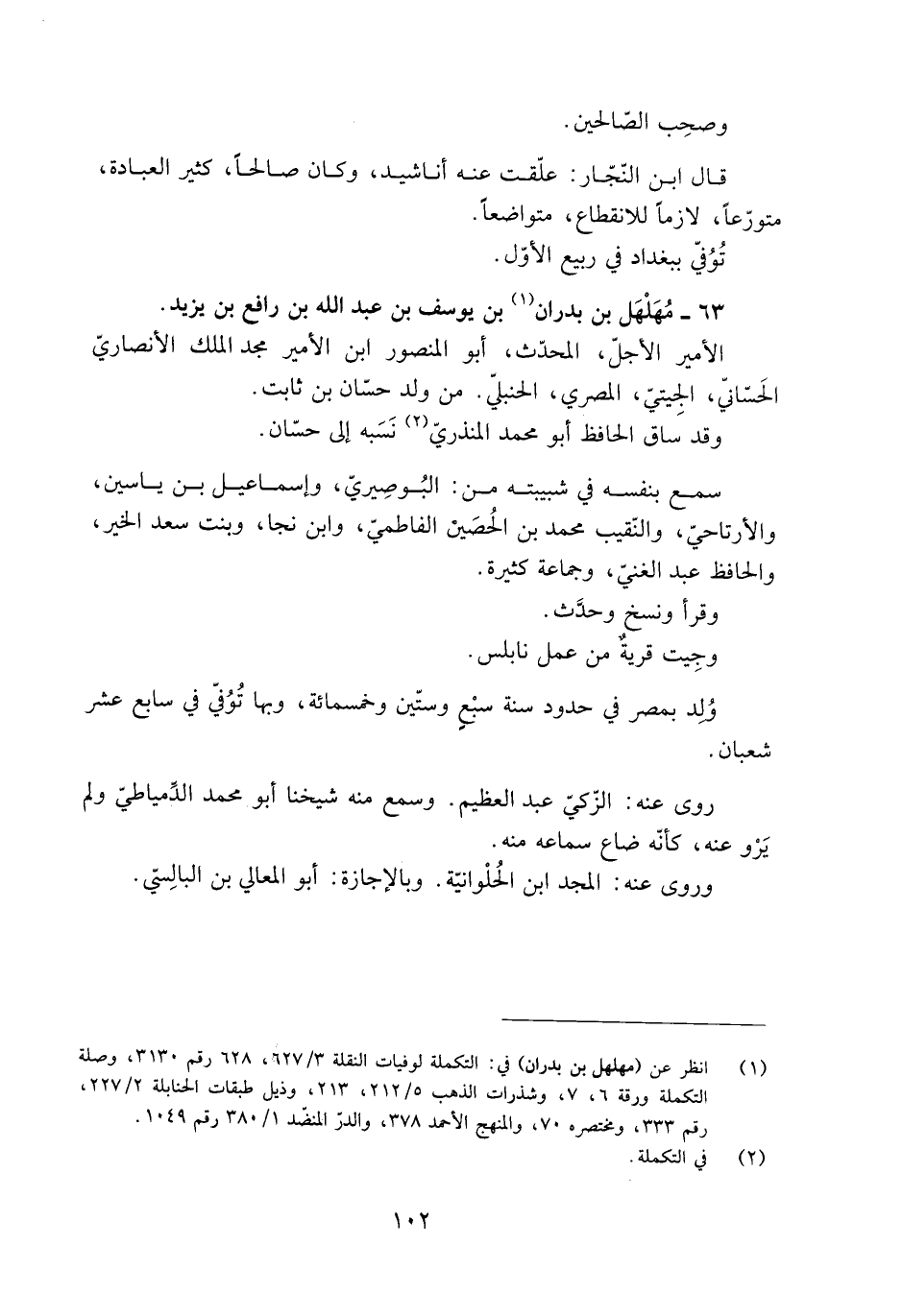 63- مُهَلْهَل بْن بدران [1] بْن يوسف بْن عَبْد اللَّه بْن رافع بْن يزيد.