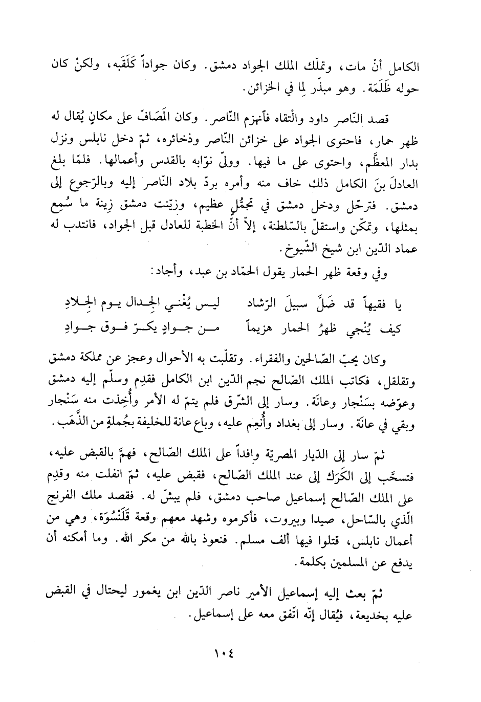 الكامل أنْ مات، وتملّك الملك الجواد دمشق. وكان جوادا كلقبه، ولكن كان حوله ظلمة. وهو مبذّر لما في الخزائن.