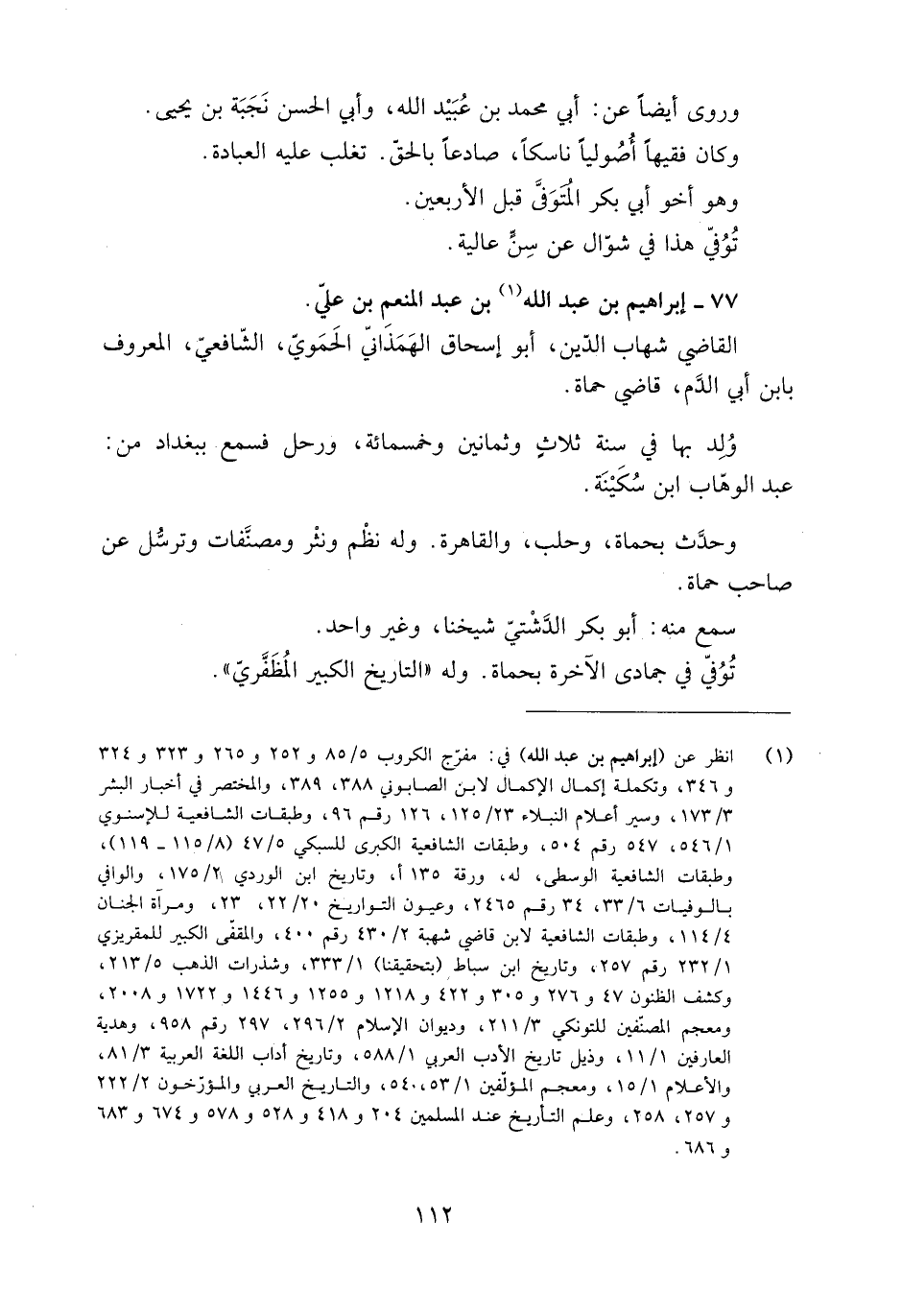 [1] انظر عن (إبراهيم بن عبد الله) في: مفرّج الكروب 5/ 85 و 252 و 265 و 323 و 324 و 346، وتكملة إكمال الإكمال لابن الصابوني 388، 389، والمختصر في أخبار البشر 3/ 173، وسير أعلام النبلاء 23/ 125، 126 رقم 96، وطبقات الشافعية للإسنويّ 1/ 546، 547 رقم 504، وطبقات الشافعية الكبرى للسبكي 5/ 47 (8/ 115- 119) ، وطبقات الشافعية الوسطى، له، ورقة 135 أ، وتاريخ ابن الوردي 2/ 175، والوافي بالوفيات 6/ 33، 34 رقم 2465، وعيون التواريخ 20/ 22، 23، ومرآة الجنان 4/ 114، وطبقات الشافعية لابن قاضي شهبة 2/ 430 رقم 400، والمقفّى الكبير للمقريزي 1/ 232 رقم 257، وتاريخ ابن سباط (بتحقيقنا) 1/ 333، وشذرات الذهب 5/ 213، وكشف الظنون 47 و 276 و 305 و 422 و 1218 و 1255 و 1446 و 1722 و 2008، ومعجم المصنّفين للتونكي 3/ 211، وديوان الإسلام 2/ 296، 297 رقم 958، وهدية العارفين 1/ 11، وذيل تاريخ الأدب العربيّ 1/ 588، وتاريخ آداب اللغة العربية 3/ 81، والأعلام 1/ 15، ومعجم المؤلّفين 1/ 53، 54، والتاريخ العربيّ والمؤرّخون 2/ 222 و 257، 258، وعلم التأريخ عند المسلمين 204 و 418 و 528 و 578 و 674 و 683 و 686.