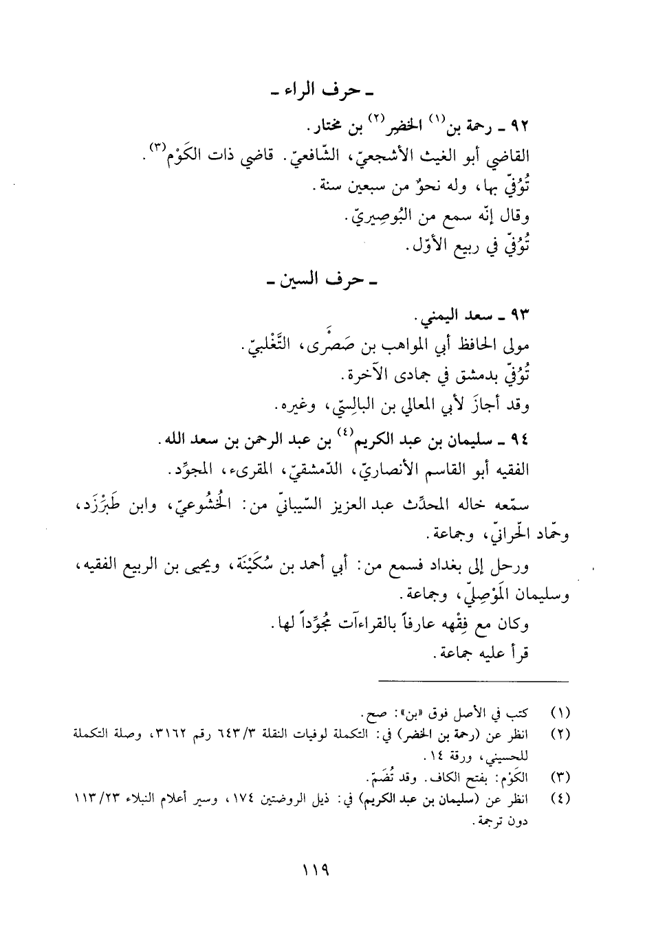 [4] انظر عن (سليمان بن عبد الكريم) في: ذيل الروضتين 174، وسير أعلام النبلاء 23/ 113 دون ترجمة.