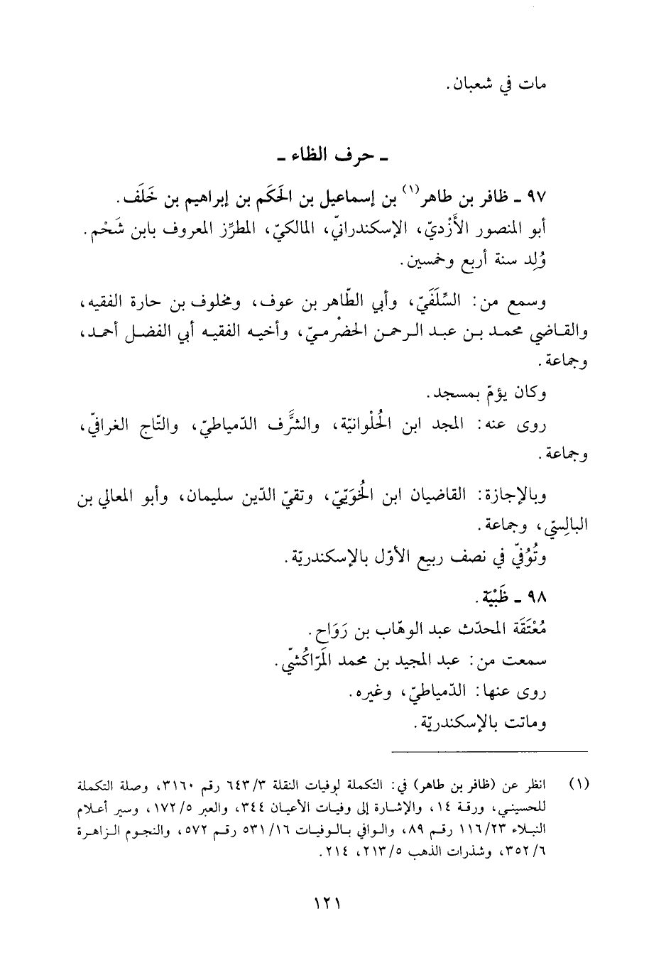 [1] انظر عن (ظافر بن طاهر) في: التكملة لوفيات النقلة 3/ 643 رقم 3160، وصلة التكملة للحسيني، ورقة 14، والإشارة إلى وفيات الأعيان 344، والعبر 5/ 172، وسير أعلام النبلاء 23/ 116 رقم 89، والوافي بالوفيات 16/ 531 رقم 572، والنجوم الزاهرة 6/ 352، وشذرات الذهب 5/ 213، 214.