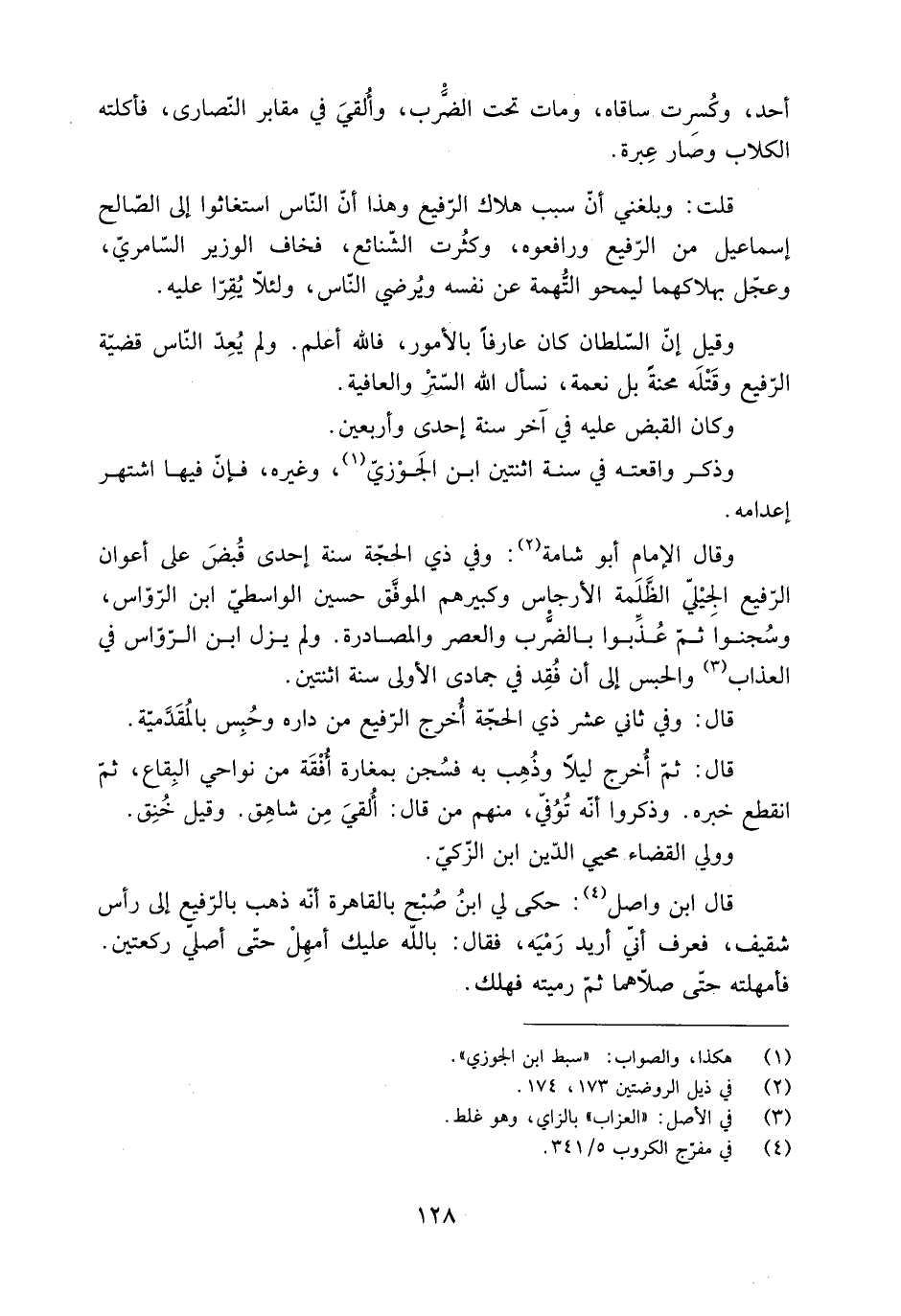 وقال الإِمَام أَبُو شامة [2] : وفي ذي الحجّة سنة إحدى قُبضَ عَلَى أعوان الرّفيع الْجِيليّ الظَّلَمة الأرجاس وكبيرهم الموفَّق حسين الواسطيّ ابن الرّوّاس، وسُجنوا ثُمَّ عُذِّبوا بالضَّرْب والعصر والمصادرة. ولم يزل ابن الرّوّاس فِي العذاب [3] والحبس إلى أن فُقِد فِي جمادى الأولى سنة اثنتين.