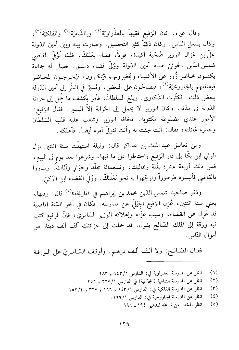 وذكر صاحبنا شمس الدّين مُحَمَّد بْن إِبْرَاهِيم فِي «تاريخه» [5] قَالَ: وفيها، يعني سنة اثنتين، عُزِل الرّفيع الْجِيليّ عَن مدارسه. فكان فِي آخر السّنة الماضية قد عُزِل عَن القضاء، وسبب عزْله وإهلاكه الوزير السّامريّ، فإنّ الرفيع كتب فِيهِ ورقة إلى الملك الصّالح يَقْولُ: قد حملت إلى خزائنك ألف ألف دينار من أموال النّاس.