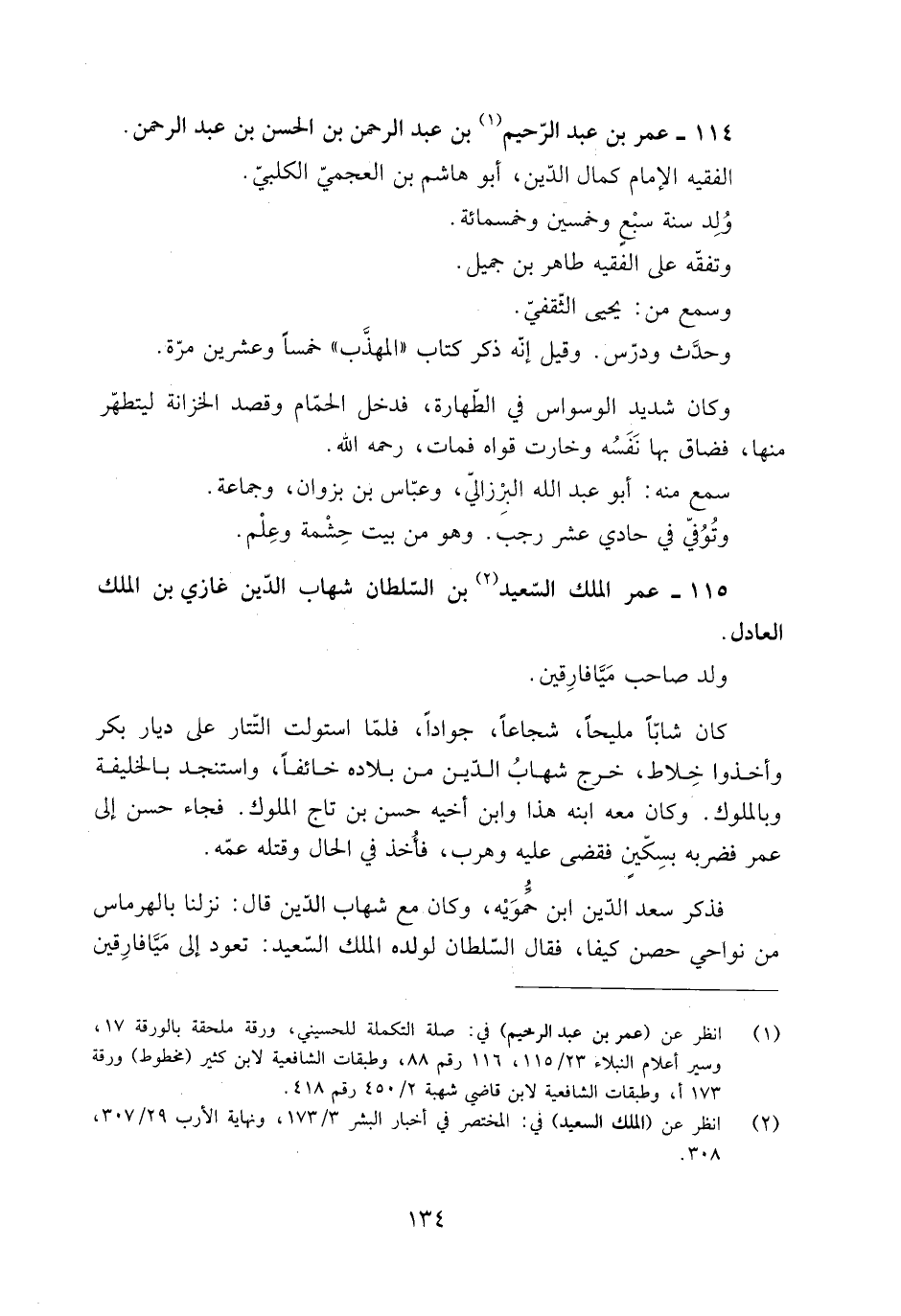 [1] انظر عن (عمر بن عبد الرحيم) في: صلة التكملة للحسيني، ورقة ملحقة بالورقة 17، وسير أعلام النبلاء 23/ 115، 116 رقم 88، وطبقات الشافعية لابن كثير (مخطوط) ورقة 173 أ، وطبقات الشافعية لابن قاضي شهبة 2/ 450 رقم 418.