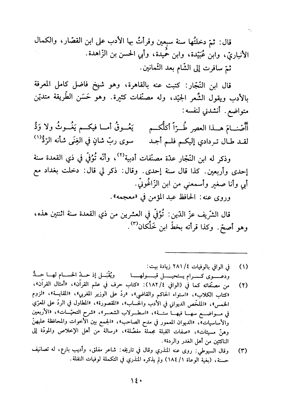 وذكر لَهُ ابن النّجّار عدّة مصنّفات أدبية [2] ، وَأَنَّهُ تُوُفّي فِي ذي القعدة سنة إحدى وأربعين. كذا قَالَ سنة إحدى. وقال: ذكر لي قَالَ: دخلت بغداد مَعَ أَبِي وأنا صغير وأسمعني من ابن الزّاغُونيّ.