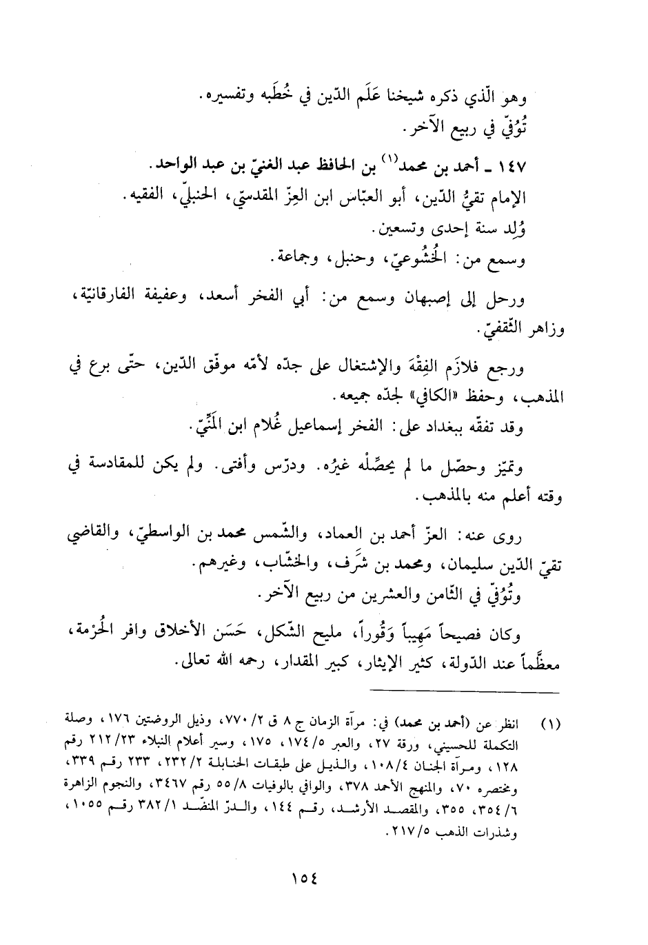 [1] انظر عن (أحمد بن محمد) في: مرآة الزمان ج 8 ق 2/ 770، وذيل الروضتين 176، وصلة التكملة للحسيني، ورقة 27، والعبر 5/ 174، 175، وسير أعلام النبلاء 23/ 212 رقم 128، ومرآة الجنان 4/ 108، والذيل على طبقات الحنابلة 2/ 232، 233 رقم 339، ومختصره 70، والمنهج الأحمد 378، والوافي بالوفيات 8/ 55 رقم 3467، والنجوم الزاهرة 6/ 354، 355، والمقصد الأرشد، رقم 144، والدرّ المنضّد 1/ 382 رقم 1055، وشذرات المذهب 5/ 217.