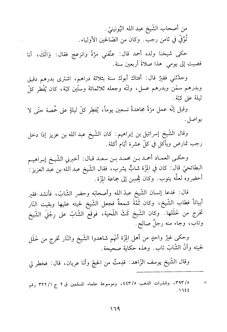 وحكى العماد أَحْمَد بْن مُحَمَّد بْن سَعْد قَالَ: أخبرني الشَّيْخ إِبْرَاهِيم البطائحيّ قَالَ: كَانَ فِي المِزّة شابٌّ يشرب، فَقَالَ الشَّيْخ عَبْد اللَّه بْن عَبْد العزيز: