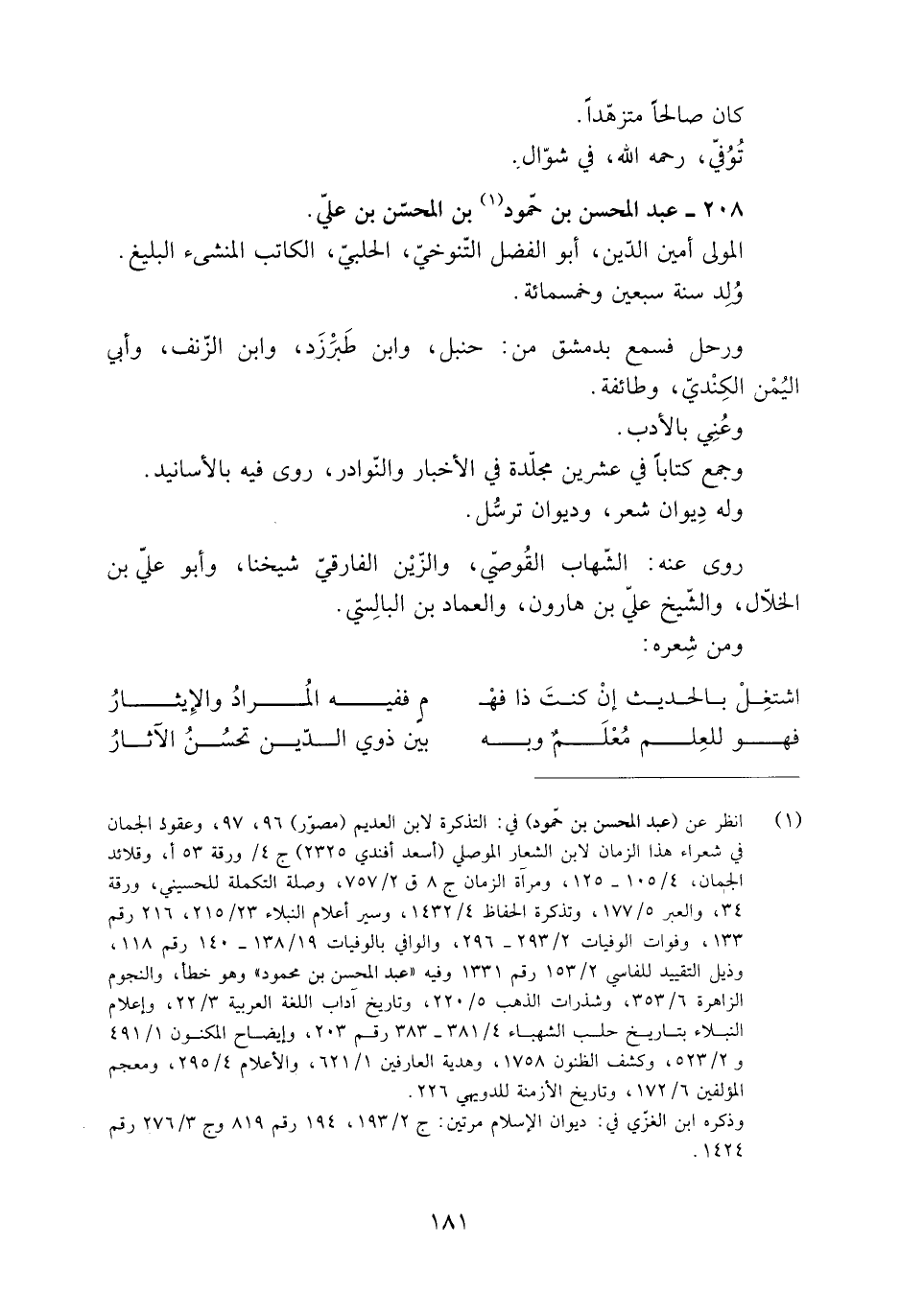 [1] انظر عن (عبد المحسن بن حمّود) في: التذكرة لابن العديم (مصوّر) 96، 97، وعقود الجمان في شعراء هذا الزمان لابن الشعار الموصلي (أسعد أفندي 2325) ج 4/ ورقة 53 أ، وقلائد الجمان، 4/ 105- 125، ومرآة الزمان ج 8 ق 2/ 757، وصلة التكملة للحسيني، ورقة 34، والعبر 5/ 177، وتذكرة الحفاظ 4/ 1432، وسير أعلام النبلاء 23/ 215، 216 رقم 133، وفوات الوفيات 2/ 293- 296، والوافي بالوفيات 19/ 138- 140 رقم 118، وذيل التقييد للفاسي 2/ 153 رقم 1331 وفيه «عبد المحسن بن محمود» وهو خطأ، والنجوم الزاهرة 6/ 353، وشذرات الذهب 5/ 220، وتاريخ آداب اللغة العربية 3/ 22، وإعلام النبلاء بتاريخ حلب الشهباء 4/ 381- 383 رقم 203، وإيضاح المكنون 1/ 491 و 2/ 523، وكشف الظنون 1758، وهدية العارفين 1/ 621، والأعلام 4/ 295، ومعجم المؤلفين 6/ 172، وتاريخ الأزمنة للدويهي 226.