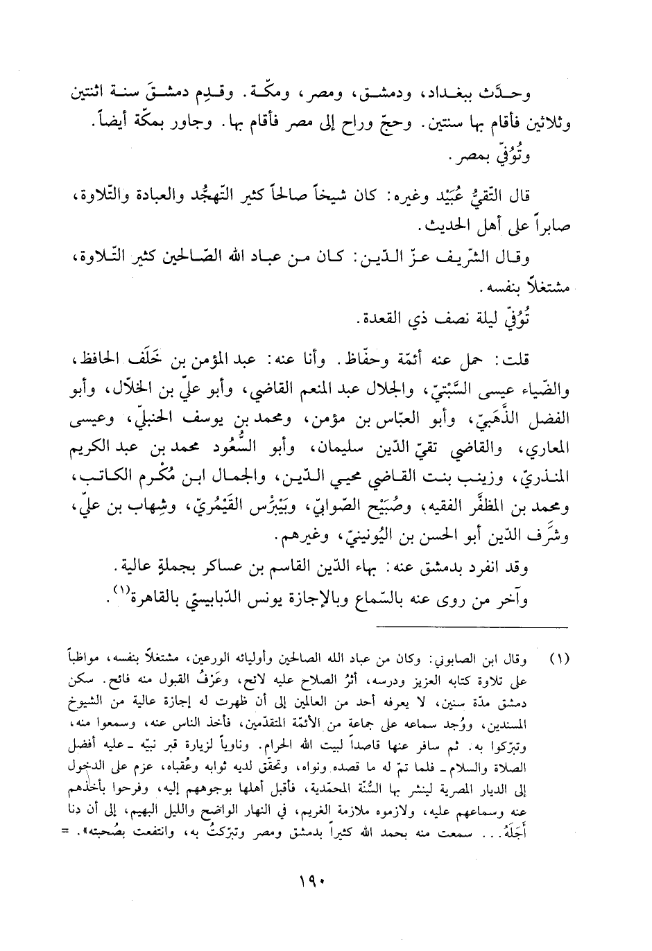 [1] وقال ابن الصابوني: وكان من عباد الله الصالحين وأوليائه الورعين، مشتغلا بنفسه، مواظبا على تلاوة كتابه العزيز ودرسه، أثر الصلاح عليه لائح، وعرف القبول منه فائح. سكن دمشق مدّة سنين، لا يعرفه أحد من العالمين إلى أن ظهرت له إجازة عالية من الشيوخ المسندين، ووجد سماعه على جماعة من الأئمّة المتقدّمين، فأخذ الناس عنه، وسمعوا منه، وتبرّكوا به. ثم سافر عنها قاصدا لبيت الله الحرام. وناويا لزيارة قبر نبيّه- عليه أفضل الصلاة والسلام- فلما تمّ له ما قصده ونواه، وتحقّق لديه ثوابه وعقباه، عزم على الدخول إلى الديار المصرية لينشر بها السّنّة المحمّدية، فأقبل أهلها بوجوههم إليه، وفرحوا بأخذهم عنه وسماعهم عليه، ولازموه ملازمة الغريم، في النهار الواضح والليل البهيم، إلى أن دنا أجله ... سمعت منه بحمد الله كثيرا بدمشق ومصر وتبرّكت به، وانتفعت بصحبته» .