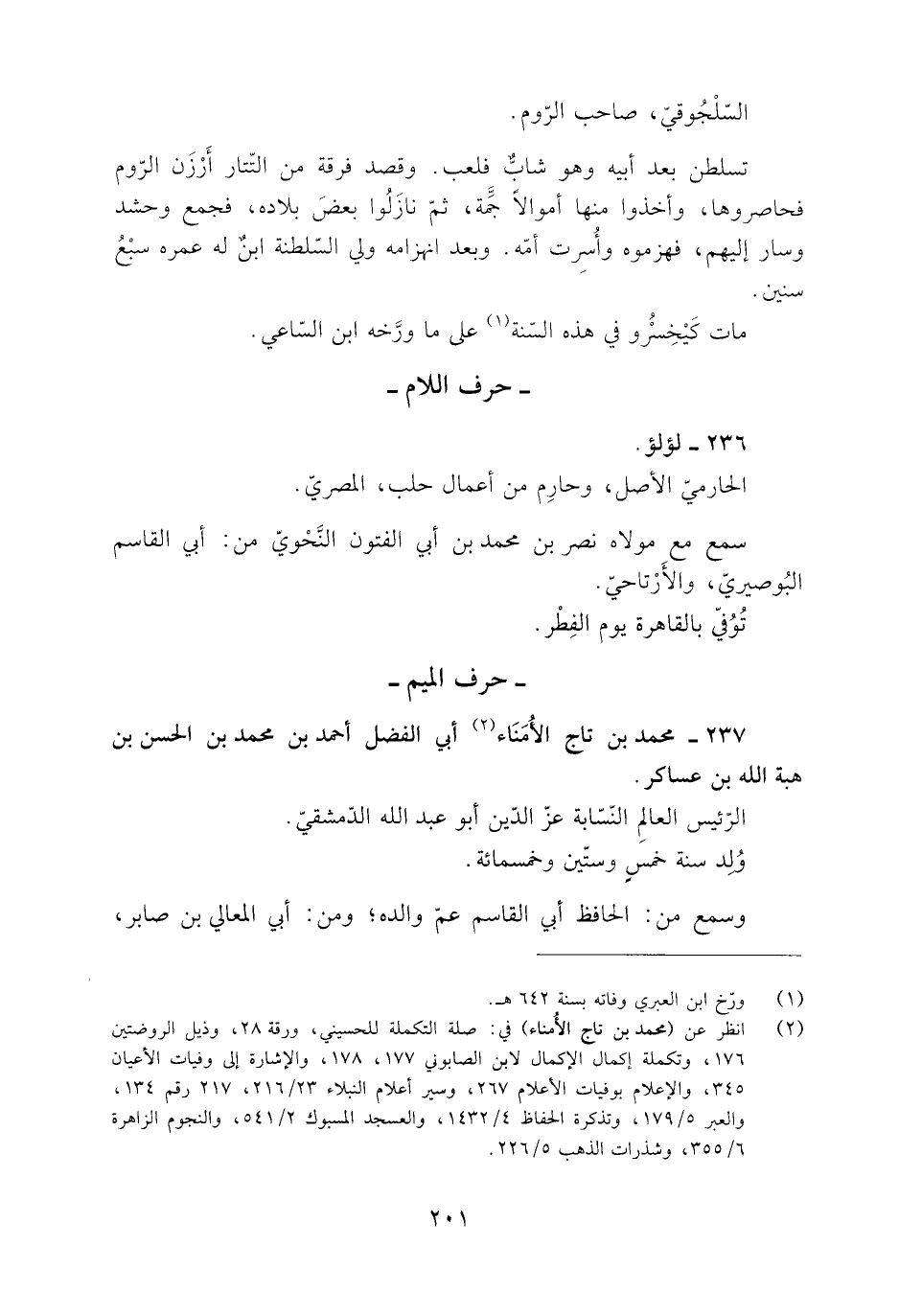 [2] انظر عن (محمد بن تاج الأمناء) في: صلة التكملة للحسيني، ورقة 28، وذيل الروضتين 176، وتكملة إكمال الإكمال لابن الصابوني 177، 178، والإشارة إلى وفيات الأعيان 345، والإعلام بوفيات الأعلام 267، وسير أعلام النبلاء 23/ 216، 217 رقم 134، والعبر 5/ 179، وتذكرة الحفاظ 4/ 1432، والعسجد المسبوك 2/ 541، والنجوم الزاهرة 6/ 355، وشذرات الذهب 5/ 226.