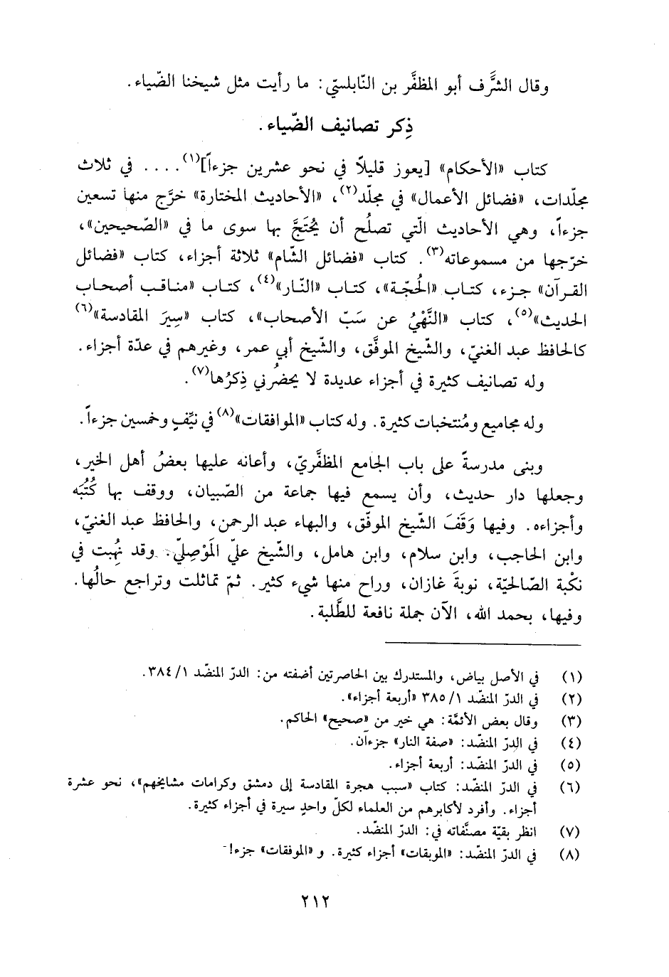 [6] في الدرّ المنضّد: كتاب «سبب هجرة المقادسة إلى دمشق وكرامات مشايخهم» ، نحو عشرة أجزاء. وأفرد لأكابرهم من العلماء لكلّ واحد سيرة في أجزاء كثيرة.