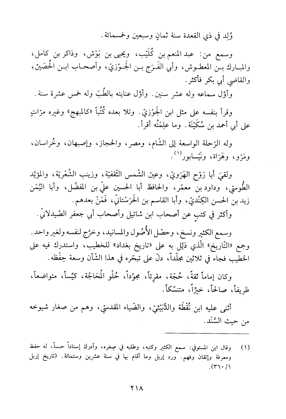 [1] وقال ابن المستوفي: سمع الكثير وكتبه، وطلبه في صغره، وأدرك إسنادا حسنا، له حفظ ومعرفة وإتقان وفهم. ورد إربل وما أقام بها في سنة عشرين وستمائة. (تاريخ إربل 1/ 360) .