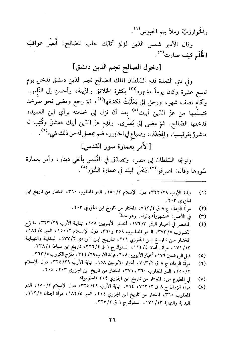 [6] مرآة الزمان ج 8 ق 2/ 763، أخبار الأيوبيين 158، نهاية الأرب 29/ 324، دول الإسلام 2/ 150، الدر المطلوب 360 و 371، المختار من تاريخ ابن الجزري 203، 204.