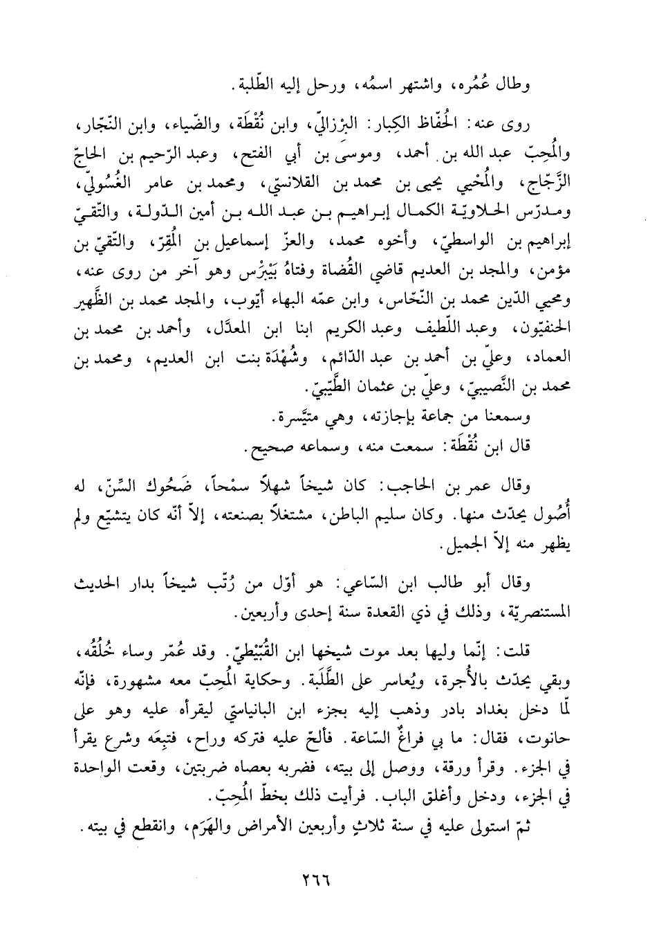 قلت: إنّما وليها بعد موت شيخها ابن القُبّيْطيّ. وقد عُمّر وساء خُلُقُه، وبقي يحدّث بالأُجرة، ويُعاسر عَلَى الطَّلَبة. وحكاية المُحِبّ معه مشهورة، فإنّه لمّا دخل بغداد بادر وذهب إِلَيْهِ بجزء ابن البانياسيّ ليقرأه عَلَيْهِ وهو عَلَى حانوت، فَقَالَ: ما بي فراغٌ السّاعة. فألحّ عَلَيْهِ فتركه وراح، فتبِعَه وشرع يقرأ فِي الجزء. وقرأ ورقة، ووصل إلى بيته، فضربه بعصاه ضربتين، وقعت الواحدة فِي الجزء، ودخل وأغلق الباب. فرأيت ذَلِكَ بخطّ المُحِبّ.