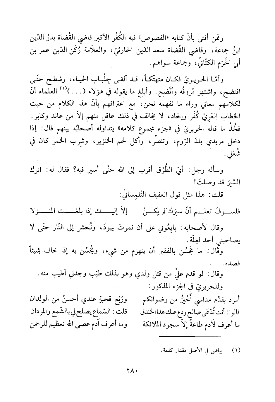 وأمّا الحريريّ فكان متهتّكا، قد ألقى جِلْباب الحياء، وشطح حتّى افتضح، واشتهر مُروقُه واتَّضح. وأبلغ ما يقوله فِي هَؤُلاءِ ( ... ) [1] العلماء أنّ لكلامهم معاني وراء ما نفهمه نَحْنُ، مَعَ اعترافهم بأنّ هذا الكلام من حيث الْخَطَّاب العَرِيّ كُفْر وإلحاد، لا يخالف فِي ذَلِكَ عاقل منهم إلّا من عاند وكابر.
