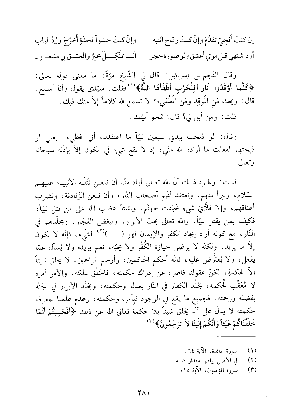 قلت: وطرد ذَلِكَ أنّ اللَّه تعالى أراد منّا أن نلعن قَتَلَة الأنبياء عليهم السّلام، ونبرأ منهم، ونعتقد أنّهم أصحاب النّار، وأن نلعن الزّنادقة، ونضرب أعناقهم، وإلّا فلأَيِّ شيءٍ خُلِقت جهنَّم، واشتدّ غضب اللَّه عَلَى من قتل نبيّا، فكيف بمن يقتل نبيّا، والله تعالى يحبّ الأبرار، ويبغض الفجّار، ويخلّدهم فِي النّار، مَعَ كونه أراد إيجاد الكفر والإيمان فهو ( ... ) [2] الشّيء، فإنّه لا يكون إلّا ما يريد. ولكنّه لا يرضى حيازة الكُفْر ولا يحبّه، نعم يريده ولا يُسأل عمّا يفعل، ولا يُعتَرَض عَلَيْهِ، فإنّه أحكم الحاكمين، وأرحم الراحمين، لا يخلق شيئا إلّا لحكمةٍ، لكنّ عقولنا قاصرة عَن إدراك حكمته، فالخلْق ملكه، والأمر أمره لا مُعَقِّب لُحكمه، يخلِّد الكفّار فِي النّار بعدله وحكمته، ويخلّد الأبرار فِي الجنّة بفضله ورحمته. فجميع ما يقع فِي الوجود فبِأمره وحكمته، وعدم علمنا بمعرفة حكمته لا يدلّ عَلَى أَنَّهُ يخلق شيئا بلا حكمة تعالى اللَّه عَن ذَلِكَ أَفَحَسِبْتُمْ أَنَّما خَلَقْناكُمْ عَبَثاً وَأَنَّكُمْ إِلَيْنا لا تُرْجَعُونَ 23: 115 [3] .