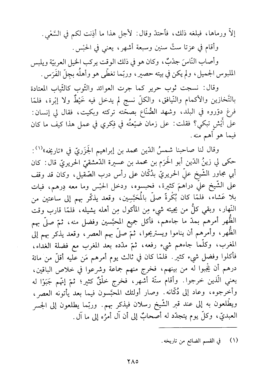 حكى لي زينُ الدّين أَبُو الحَرَم بْن مُحَمَّد بْن عسيرة الدّمشقيّ الحريريّ قَالَ: كَانَ أَبِي مجاور الشَّيْخ عَلِيّ الحريريّ بدُكّان عَلَى رأس درب الصّقيل، وكان قد وقف عَلَى الشَّيْخ عَلِيّ دراهمَ كثيرة، فحبسوه، ودخل الحبْس وما معه دِرهم، فبات بلا عَشاء، فلمّا كَانَ بُكْرةً صلّى بالمُحَبَّسِين، وقعد يذكّر بهم إلى ساعتين من النّهار، وبقي كلُّ من يجيئه شيء مِن المأكول مِن أهله يشيله، فلمّا قارب وقت الظُّهر أمرهم بمدّ ما جاءهم، فأكل جميع المحبَّسين وفضل منه، ثُمَّ صلّى بهم الظُّهر، وأمرهم أن يناموا ويستريحوا، ثُمَّ صلّى بهم العصر، وقعد يذكر بهم إلى المغرب، وكلّما جاءهم شيء رفعه، ثُمَّ مدّده بعد المغرب مَعَ فضلة الغداء، فأكلوا وفضل شيء كثير. فلمّا كَانَ فِي ثالث يوم أمرهم مَن عَلَيْهِ أقلّ من مائة درهم أن يَجْبوا لَهُ من بينهم، فخرج منهم جماعة وشرعوا فِي خلاص الباقين، يعني الّذين خرجوا. وأقام ستّة أشهر، فخرج خلْقٌ كثير، ثمّ إنّهم جَبَوا لَهُ وأخرجوه، وعاد إلى دُكّانه. وصار أولئك المحبَّسون فيما بعد يأتونه العصر، ويطْلعون بِهِ إلى عند قبر الشَّيْخ رسلان فيذكر بهم. وربّما يطلعون إلى الجسر العبديّ، وكلّ يوم يتجدّد لَهُ أصحابٌ إلى أن آل أمرُه إلى ما آل.