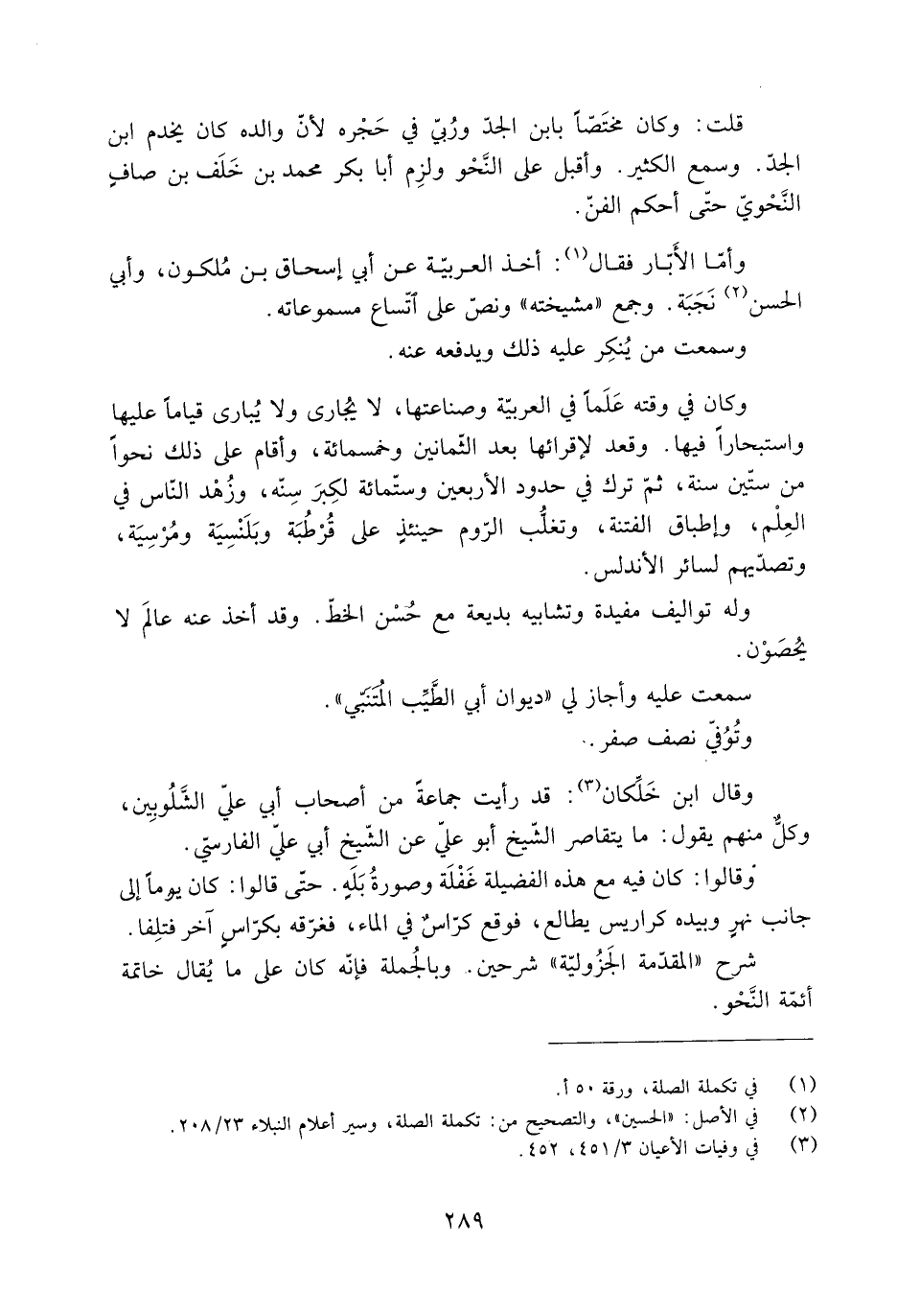 وكان في وقته علما في العربيّة وصناعتها، لا يُجارى ولا يُبارى قياما عليها واستبحارا فيها. وقعد لإقرائها بعد الثّمانين وخمسمائة، وأقام عَلَى ذَلِكَ نحوا من ستّين سنة، ثُمَّ ترك فِي حدود الأربعين وستّمائة لكِبَر سِنّه، وزُهْد النّاس فِي العِلْم، وإطباق الفتنة، وتغلُّب الرّوم حينئذٍ عَلَى قُرْطُبَة وبَلَنْسِيَة ومُرْسِيَة، وتصدّيهم لسائر الأندلس.