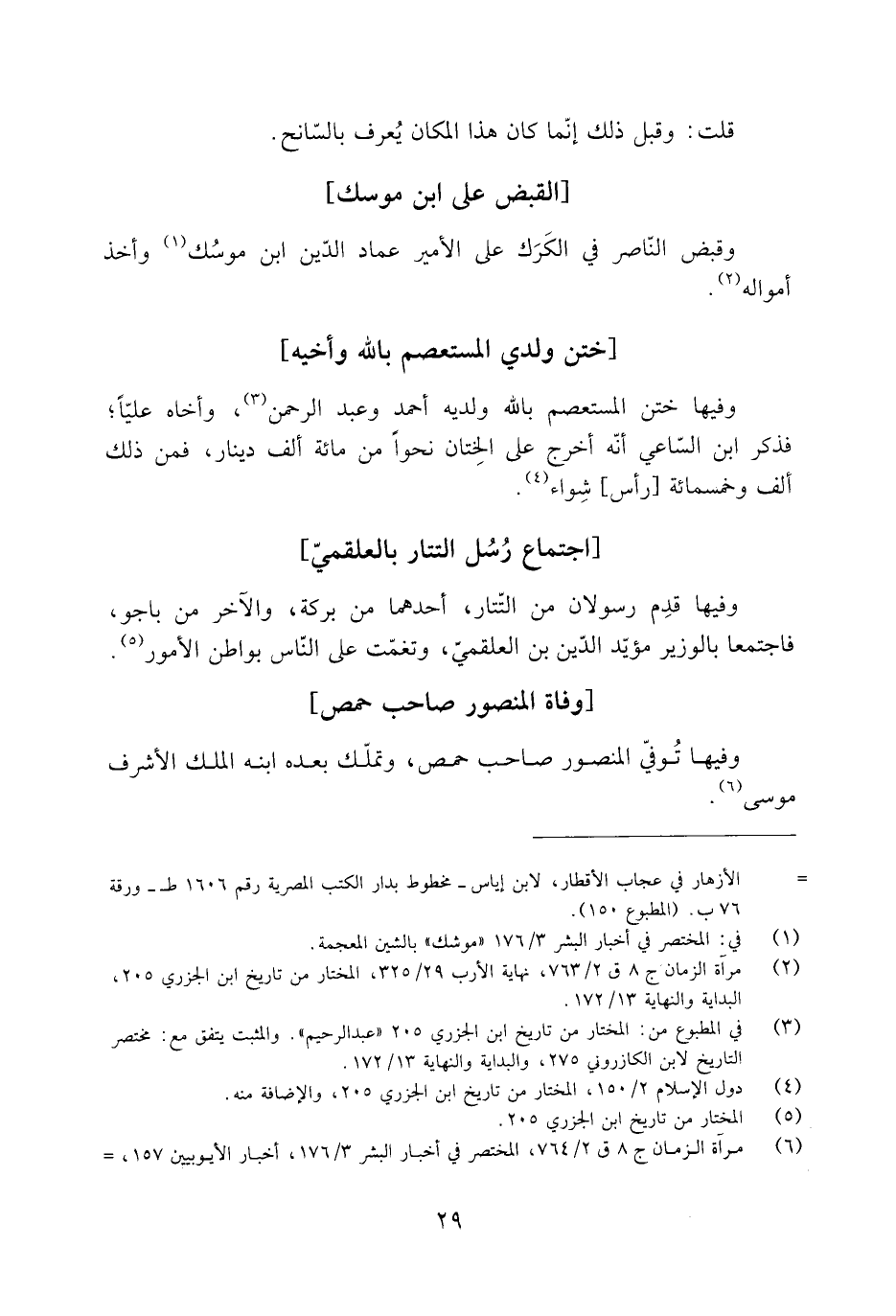 [2] مرآة الزمان ج 8 ق 2/ 763، نهاية الأرب 29/ 325، المختار من تاريخ ابن الجزري 205، البداية والنهاية 13/ 172.