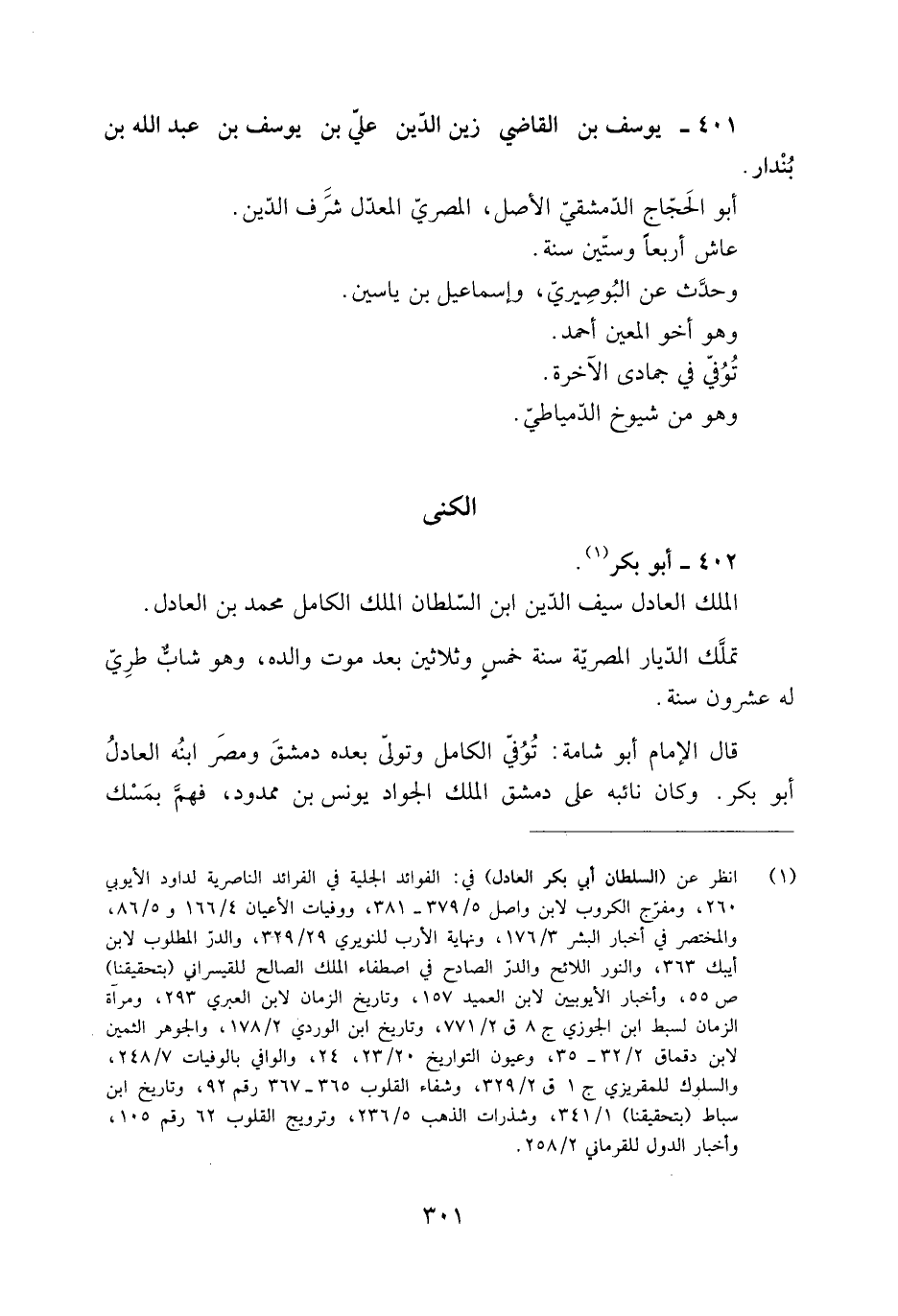 [1] انظر عن (السلطان أبي بكر العادل) في: الفوائد الجلية في الفرائد الناصرية لداود الأيوبي 260، ومفرّج الكروب لابن واصل 5/ 379- 381، ووفيات الأعيان 4/ 166 و 5/ 86، والمختصر في أخبار البشر 3/ 176، ونهاية الأرب للنويري 29/ 329، والدرّ المطلوب لابن أيبك 363، والنور اللائح والدرّ الصادح في اصطفاء الملك الصالح للقيسراني (بتحقيقنا) ص 55، وأخبار الأيوبيين لابن العميد 157، وتاريخ الزمان لابن العبري 293، ومرآة الزمان لسبط ابن الجوزي ج 8 ق 2/ 771، وتاريخ ابن الوردي 2/ 178، والجوهر الثمين لابن دقماق 2/ 32- 35، وعيون التواريخ 20/ 23، 24، والوافي بالوفيات 7/ 248، والسلوك للمقريزي ج 1 ق 2/ 329، وشفاء القلوب 365- 367 رقم 92، وتاريخ ابن سباط (بتحقيقنا) 1/ 341، وشذرات الذهب 5/ 236، وترويج القلوب 62 رقم 105، وأخبار الدول للقرماني 2/ 258.